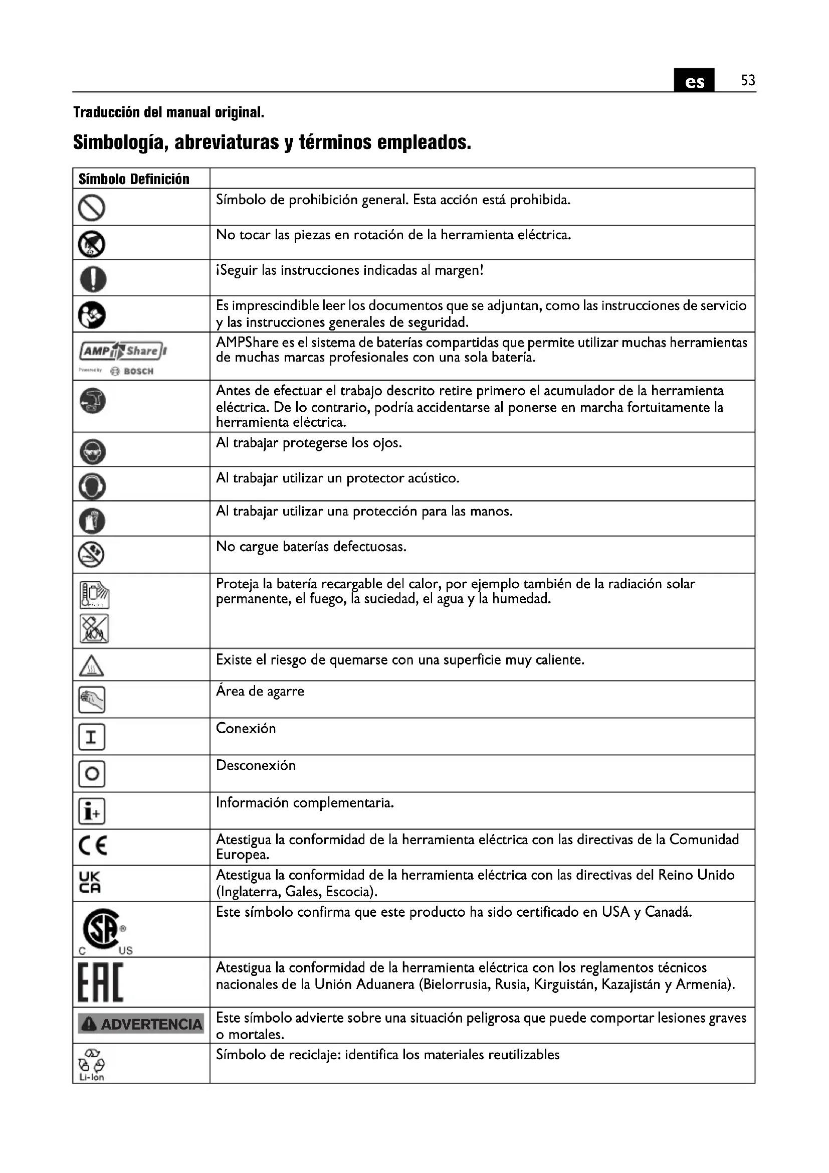 Traducción del manual original. Simbología, abreviaturas y términos empleados. Símbolo Definición Símbolo de prohibición general. Esta acción está prohibida. No tocar las piezas en rotación de la herramienta eléctrica. ¡Seguir las instrucciones indicadas al margen! Es imprescindible leer los documentos que se adjuntan, como las instrucciones de servicio y las instrucciones generales de seguridad. AMPShare es el sistema de baterías compartidas que permite utilizar muchas herramientas de muchas marcas profesionales con una sola batería. Antes de efectuar el trabajo descrito retire primero el acumulador de la herramienta eléctrica. De lo contrario, podría accidentarse al ponerse en marcha fortuitamente la herramienta eléctrica. Al trabajar protegerse los ojos. Al trabajar utilizar un protector acústico. Al trabajar utilizar una protección para las manos. No cargue baterías defectuosas. Proteja la batería recargable del calor, por ejemplo también de la radiación solar permanente, el fuego, la suciedad, el agua y la humedad. Existe el riesgo de quemarse con una superficie muy caliente. Área de agarre Conexión Desconexión Información complementaria. Atestigua la conformidad de la herramienta eléctrica con las directivas de la Comunidad Europea. Atestigua la conformidad de la herramienta eléctrica con las directivas del Reino Unido (Inglaterra, Gales, Escocia). Este símbolo confirma que este producto ha sido certificado en USA y Canadá. Atestigua la conformidad de la herramienta eléctrica con los reglamentos técnicos nacionales de la Unión Aduanera (Bielorrusia, Rusia, Kirguistán, Kazajistán y Armenia). Este símbolo advierte sobre una situación peligrosa que puede comportar lesiones graves o mortales. Símbolo de reciclaje: identifica los materiales reutilizables max.50°C ADVERTENCIA54