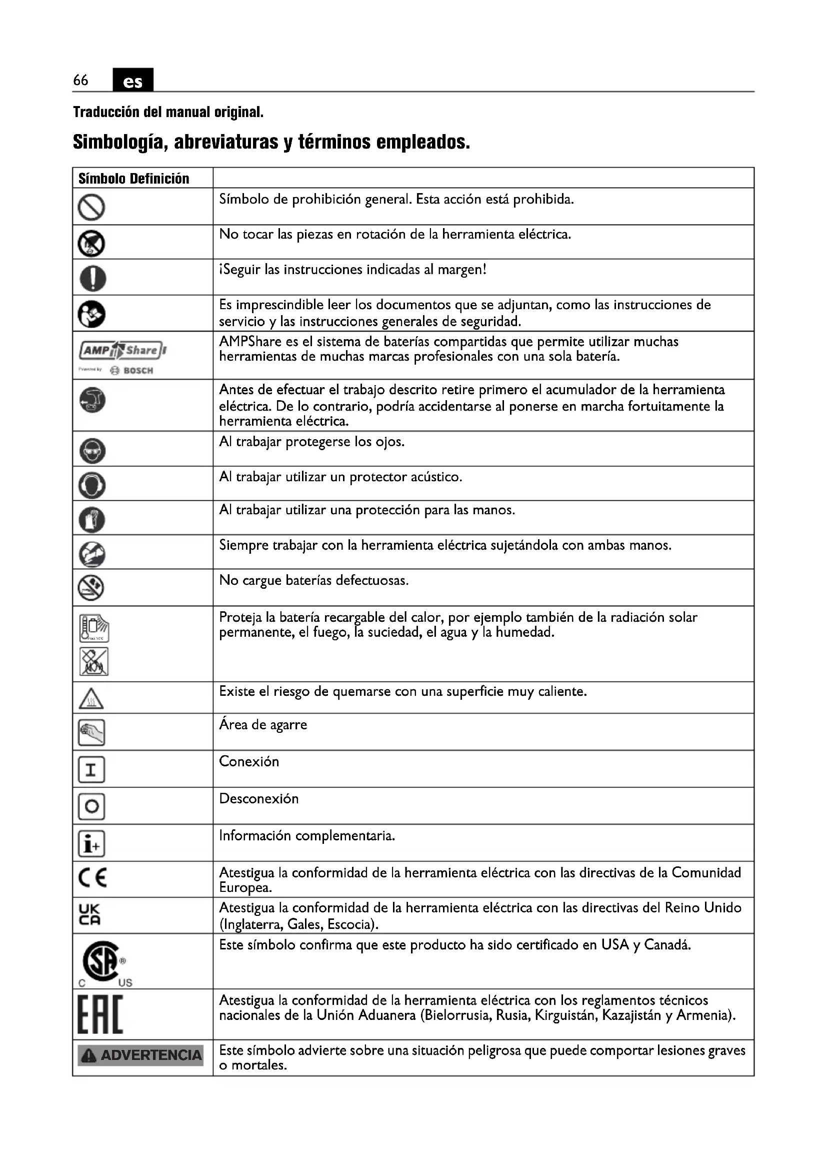Traducción del manual original. Simbología, abreviaturas y términos empleados. Símbolo Definición Símbolo de prohibición general. Esta acción está prohibida. No tocar las piezas en rotación de la herramienta eléctrica. ¡Seguir las instrucciones indicadas al margen! Es imprescindible leer los documentos que se adjuntan, como las instrucciones de servicio y las instrucciones generales de seguridad. AMPShare es el sistema de baterías compartidas que permite utilizar muchas herramientas de muchas marcas profesionales con una sola batería. Antes de efectuar el trabajo descrito retire primero el acumulador de la herramienta eléctrica. De lo contrario, podría accidentarse al ponerse en marcha fortuitamente la herramienta eléctrica. Al trabajar protegerse los ojos. Al trabajar utilizar un protector acústico. Al trabajar utilizar una protección para las manos. Siempre trabajar con la herramienta eléctrica sujetándola con ambas manos. No cargue baterías defectuosas. Proteja la batería recargable del calor, por ejemplo también de la radiación solar permanente, el fuego, la suciedad, el agua y la humedad. Existe el riesgo de quemarse con una superficie muy caliente. Área de agarre Conexión Desconexión Información complementaria. Atestigua la conformidad de la herramienta eléctrica con las directivas de la Comunidad Europea. Atestigua la conformidad de la herramienta eléctrica con las directivas del Reino Unido (Inglaterra, Gales, Escocia). Este símbolo confirma que este producto ha sido certificado en USA y Canadá. Atestigua la conformidad de la herramienta eléctrica con los reglamentos técnicos nacionales de la Unión Aduanera (Bielorrusia, Rusia, Kirguistán, Kazajistán y Armenia). Este símbolo advierte sobre una situación peligrosa que puede comportar lesiones graves o mortales. max.50°C ADVERTENCIA67