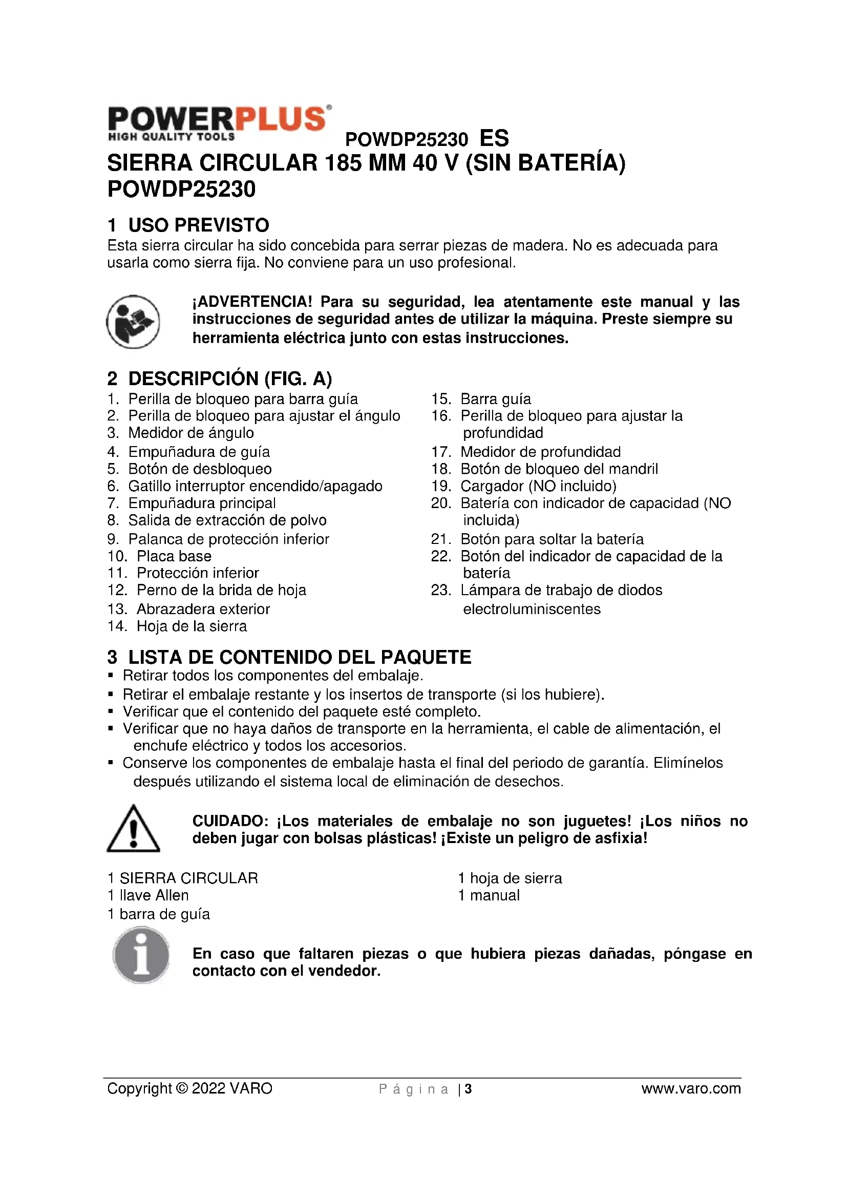 Copyright © 2022 VARO P á g i n a | 3 www.varo.com SIERRA CIRCULAR 185 MM 40 V (SIN BATERÍA) POWDP25230 1 USO PREVISTO Esta sierra circular ha sido concebida para serrar piezas de madera. No es adecuada para usarla como sierra fija. No conviene para un uso profesional. ¡ADVERTENCIA! Para su seguridad, lea atentamente este manual y las instrucciones de seguridad antes de utilizar la máquina. Preste siempre su herramienta eléctrica junto con estas instrucciones. 2 DESCRIPCIÓN (FIG. A)