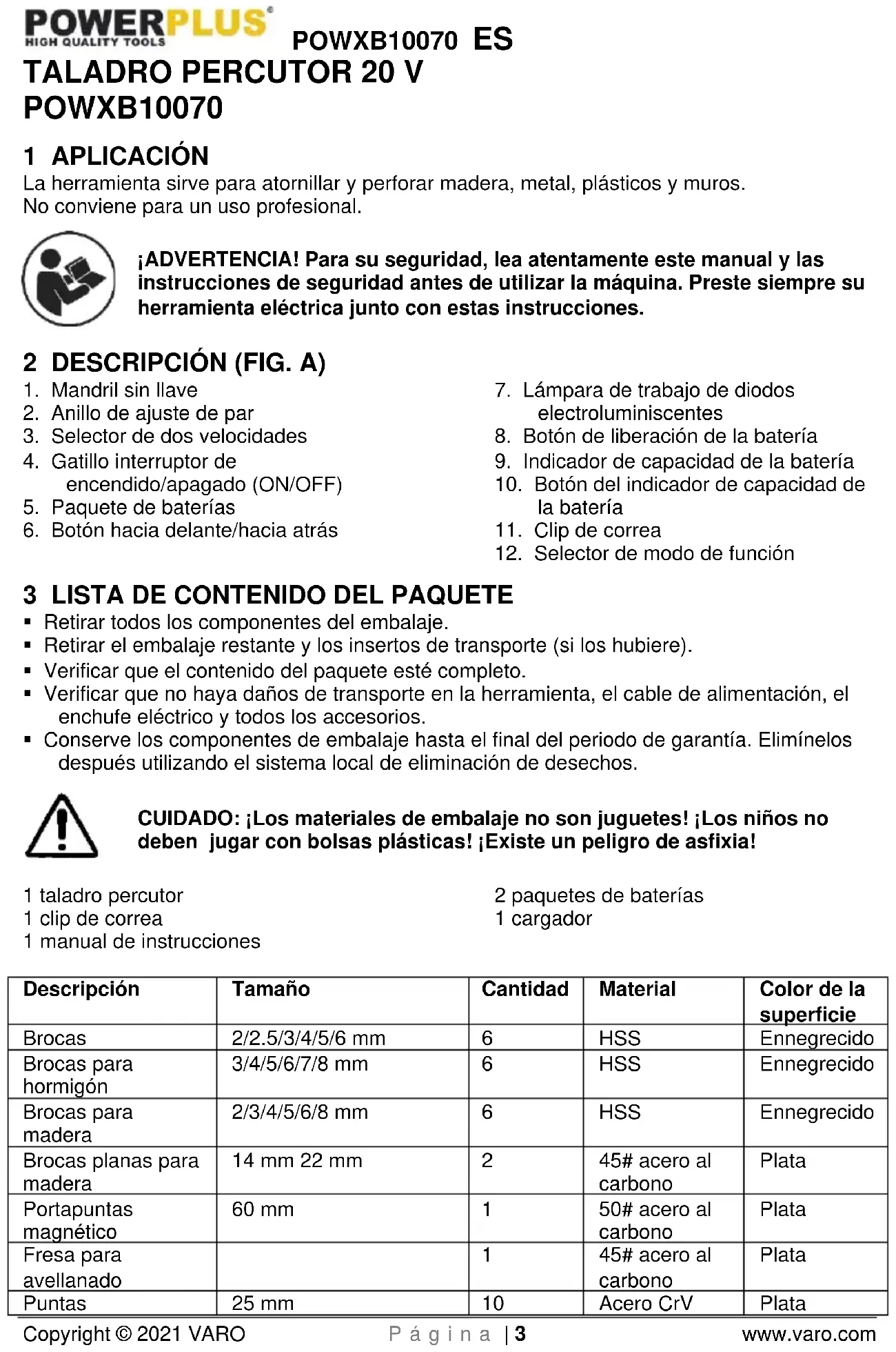VARO – Vic. Van Rompuy N.V. – Joseph Van Instraat 9. BE2500 Lier – Bélgica, declara que: Tipo de aparato: Taladro percutor 20 V - accionado por batería Marca: PowerPlus Número del producto: POWXB10060 está en conformidad con los requisitos esenciales y otras disposiciones pertinentes de las Directivas europeas aplicables, basados en la aplicación de las normas europeas armonizadas. Cualquier modificación no autorizada de este aparato anula esta declaración. Directivas europeas (incluyendo, si se aplica, sus respectivas enmiendas hasta la fecha de la firma): 2011/65/EU 2006/42/EC 2014/30/EU Normas europeas armonizadas (incluyendo, si se aplica, sus respectivas hasta la fecha de la firma): EN62841-1 : 2015 EN62841-2-1 : 2018 EN55014-1 : 2017 EN55014-2 : 2015 Custodio de la documentación técnica: Philippe Vankerkhove, VARO – Vic. Van Rompuy N.V. El suscrito actúa en nombre del director general de la compañía, Philippe Vankerkhove Asuntos reglamentarios - Director de conformidad 06/10/2020, Lier - BelgiumPOWXB10070 IT Copyright © 2021 VARO Pag. | 1 www.varo.com 1 APPLICAZIONE .............................................................................. 3