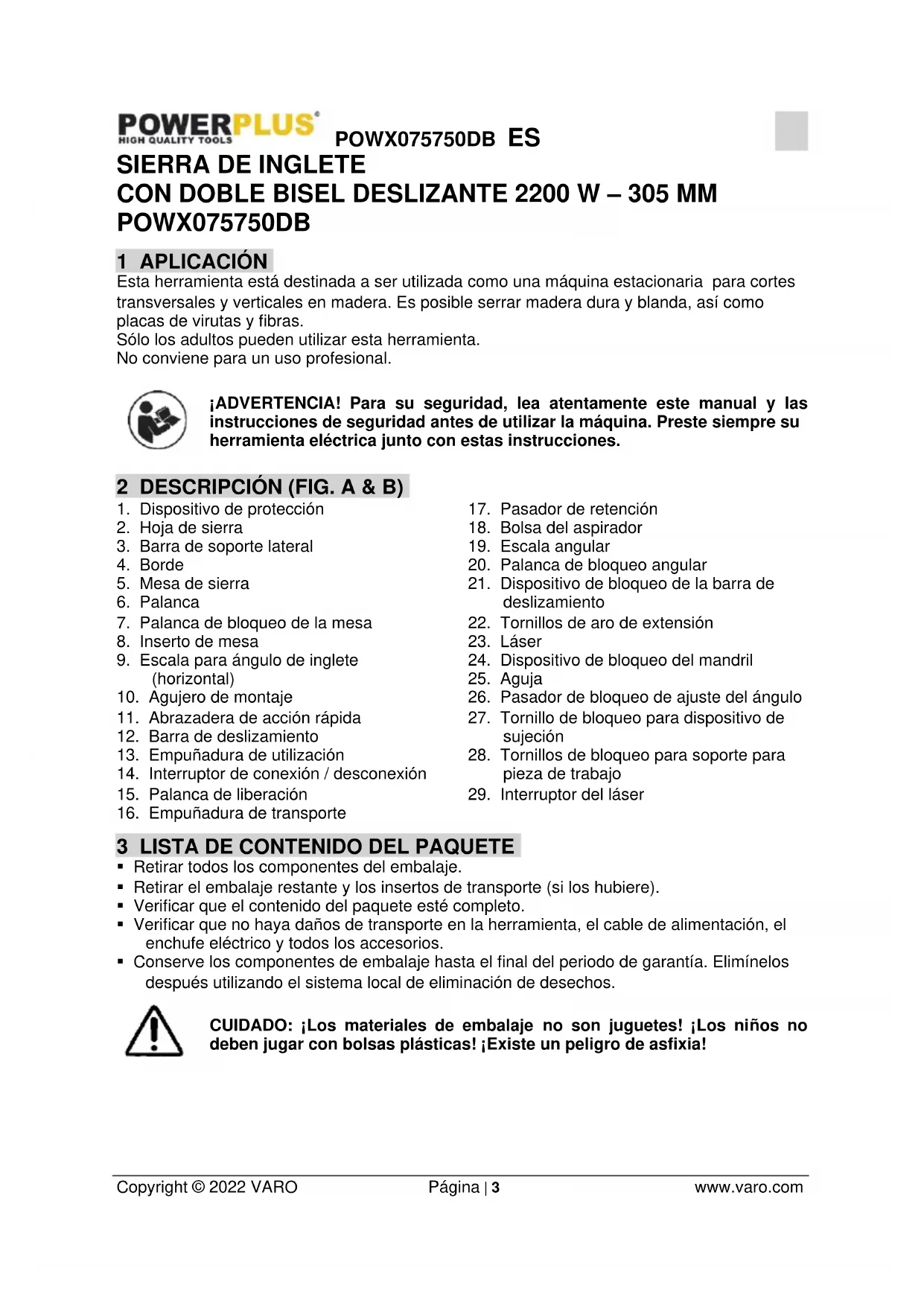 - Conserve los componentes de embalaje hasta el final del periodo de garantía. Elimínelos después utilizando el sistema local de eliminación de desechos. CUIDADO: ¡Los materiales de embalaje no son juguetes! ¡Los niños no deben jugar con bolsas plásticas! ¡Existe un peligro de asfixia!POWX075750DB ES Copyright © 2022 VARO Página | 4 www.varo.com Contenido del paquete: 1 sierra de ingletes deslizante Llave hexagonal de 4 + 6 mm 1 brida 1 manual de instrucciones 2 barras de soporte lateral 1 bolsa del aspirador 2 bordes 1 empuñadura de transporte En caso que faltaren piezas o que hubiera piezas dañadas, póngase en contacto con el vendedor. 4 SÍMBOLOS En este manual y/o en el aparato mismo se utilizan los siguientes símbolos: