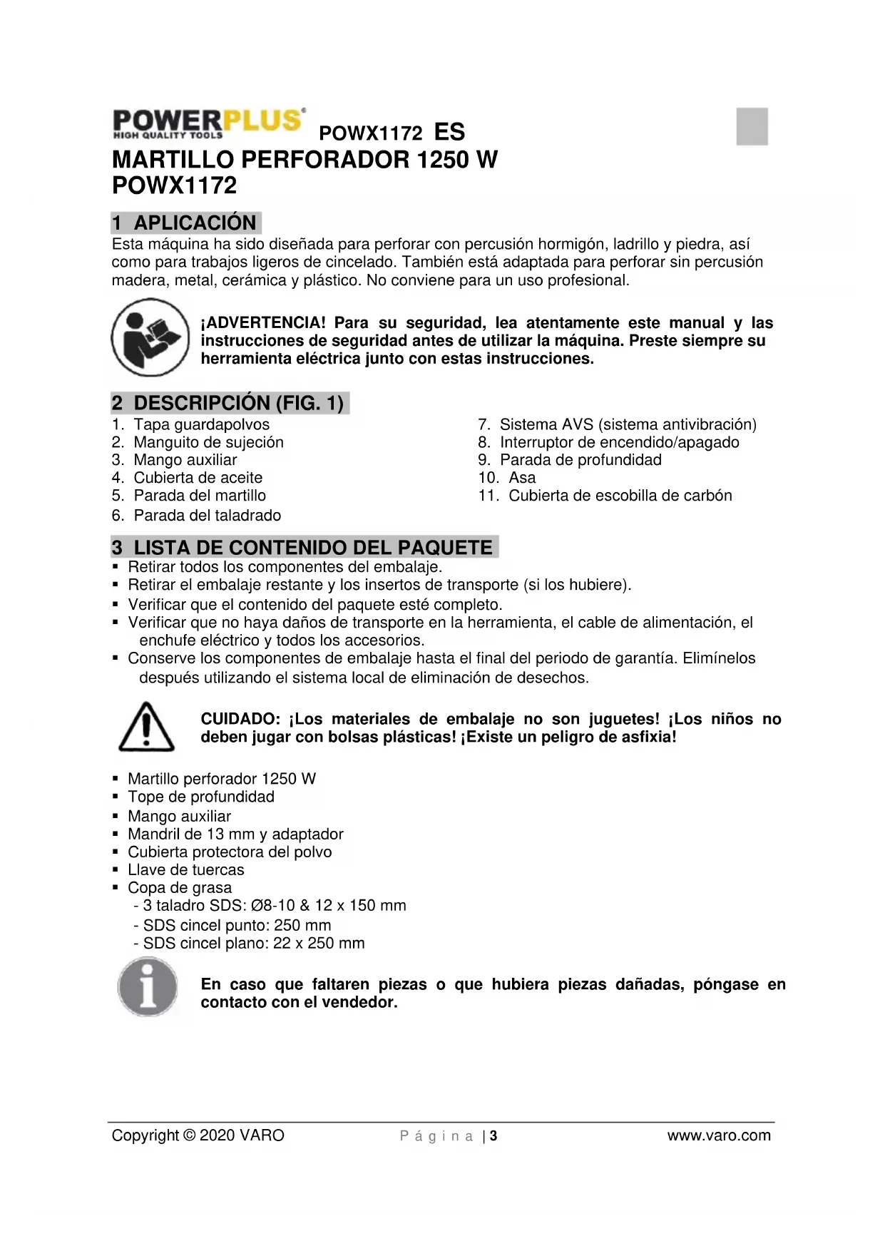 VARO N.V. – Joseph Van Instraat 9. BE2500 Lier – Bélgica, declara que: Tipo de aparato: Martillo perforador Marca: POWERplus Número del producto: POWX1172 está en conformidad con los requisitos esenciales y otras disposiciones pertinentes de las Directivas europeas aplicables, basados en la aplicación de las normas europeas armonizadas. Cualquier modificación no autorizada de este aparato anula esta declaración. Directivas europeas (incluyendo, si se aplica, sus respectivas enmiendas hasta la fecha de la firma): 2011/65/EU 2006/42/CE 2014/30/EU Normas europeas armonizadas (incluyendo, si se aplica, sus respectivas hasta la fecha de la firma): EN60745-1 : 2009 EN60745-2-6 : 2010 EN55014-1 : 2017 EN55014-2 : 2015 EN61000-3-2 : 2014 EN61000-3-11 : 2000 Custodio de la documentación técnica: Philippe Vankerkhove, VARO – Vic. Van Rompuy N.V. El suscrito actúa en nombre del director general de la compañía, Philippe Vankerkhove Asuntos reglamentarios - Director de conformidad Lier, 31/03/2020POWX1172 IT Copyright © 2020 VARO P a g . | 1 www.varo.com 1 APPLICAZIONE ................................................................................. 3 2 DESCRIZIONE (FIG. 1) ...................................................................... 3