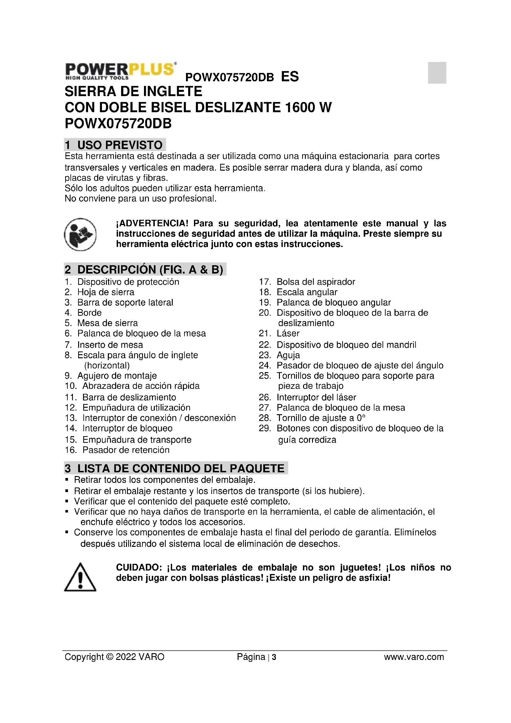 - Conserve los componentes de embalaje hasta el final del periodo de garantía. Elimínelos después utilizando el sistema local de eliminación de desechos. CUIDADO: ¡Los materiales de embalaje no son juguetes! ¡Los niños no deben jugar con bolsas plásticas! ¡Existe un peligro de asfixia!POWX075720DB ES Copyright © 2022 VARO Página | 4 www.varo.com Contenido del paquete: 1 sierra de ingletes deslizante 1 llaves Allen 1 brida 1 manual de instrucciones 2 guías laterales 1 bolsa del aspirador Si faltaran piezas o hubiera piezas dañadas, póngase en contacto con el vendedor. 4 SÍMBOLOS En este manual y/o en el aparato mismo se utilizan los siguientes símbolos: