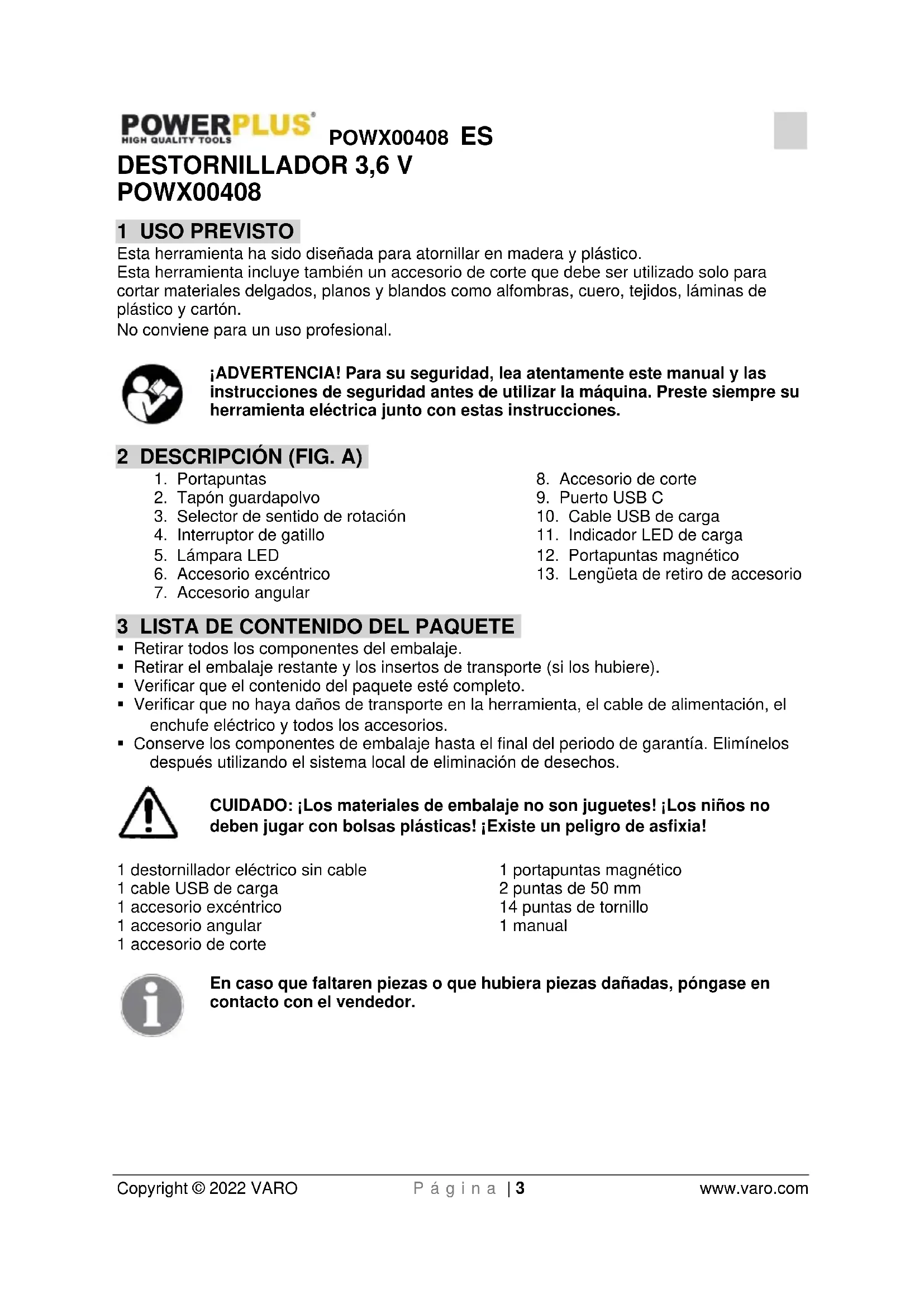 Copyright © 2022 VARO P á g i n a | 3 www.varo.com DESTORNILLADOR 3,6 V POWX00408 1 USO PREVISTO Esta herramienta ha sido diseñada para atornillar en madera y plástico. Esta herramienta incluye también un accesorio de corte que debe ser utilizado solo para cortar materiales delgados, planos y blandos como alfombras, cuero, tejidos, láminas de plástico y cartón. No conviene para un uso profesional. ¡ADVERTENCIA! Para su seguridad, lea atentamente este manual y las instrucciones de seguridad antes de utilizar la máquina. Preste siempre su herramienta eléctrica junto con estas instrucciones. 2 DESCRIPCIÓN (FIG. A)