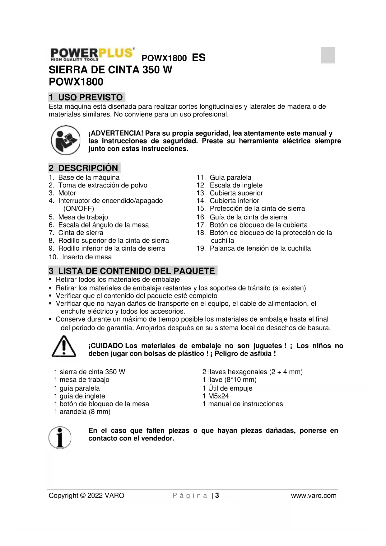 - Conserve durante un máximo de tiempo posible los materiales de embalaje hasta el final del periodo de garantía. Arrojarlos después en su sistema local de desechos de basura. ¡CUIDADO Los materiales de embalaje no son juguetes ! ¡ Los niños no deben jugar con bolsas de plástico ! ¡ Peligro de asfixia ! 1 sierra de cinta 350 W 1 mesa de trabajo 1 guía paralela 1 guía de inglete 1 botón de bloqueo de la mesa 1 arandela (8 mm) 2 llaves hexagonales (2 + 4 mm) 1 llave (8*10 mm) 1 Útil de empuje 1 M5x24 1 manual de instrucciones En el caso que falten piezas o que hayan piezas dañadas, ponerse en contacto con el vendedor.POWX1800 ES Copyright © 2022 VARO P á g i n a | 4 www.varo.com 4 SÍMBOLOS En este manual y/o en el aparato mismo se utilizan los siguientes símbolos: