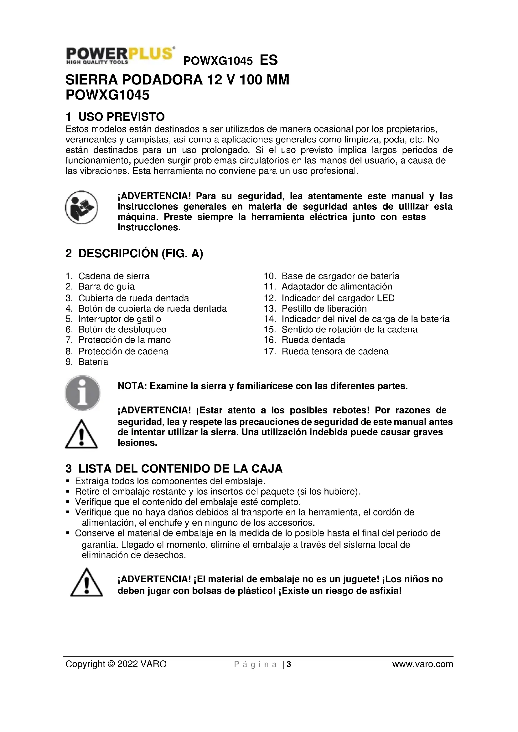 - El usuario mismo y sin ayuda puede cambiar la cadena y la barra de guía. Asegúrese siempre de efectuar los cambios con material adecuado, tal como se indica en las especificaciones del manual.POWXG1045 ES Copyright © 2022 VARO P á g i n a | 7 www.varo.com