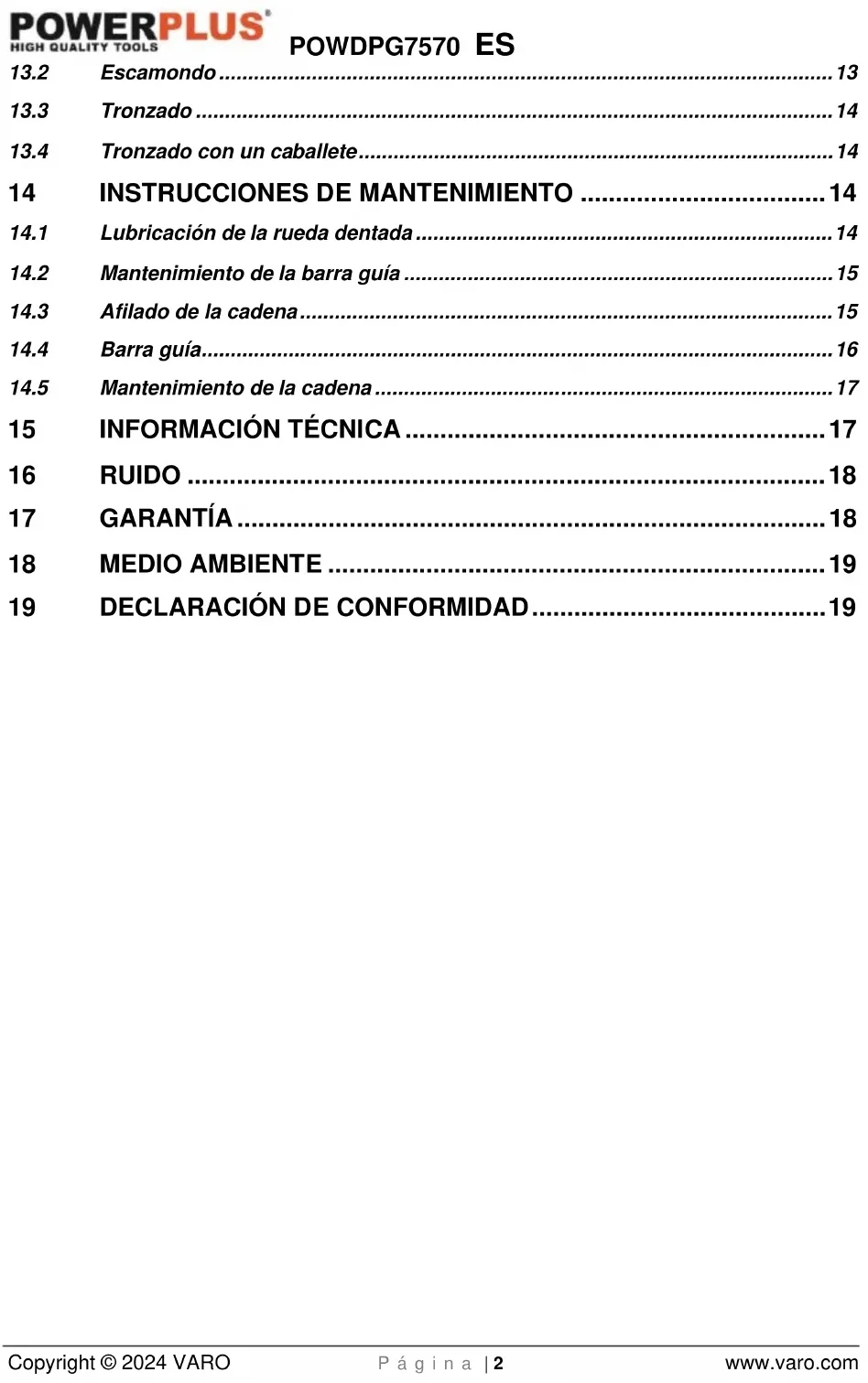 Modelo POWDPG7570 Alimentación 20 V Longitud de la hoja 300 mm Longitud de corte de la barra 285 mm Paso de cadena 9,525 mm (3/8”) Indicador de cadena 1,3 mm (0,05") Rueda de accionamiento 6 dientes Capacidad del depósito de aceite 220 ml Freno de la cadena SiPOWDPG7570 ES Copyright © 2024 VARO P á g i n a | 18 www.varo.com 16 RUIDO Valores de ruido medidos de conformidad con la norma pertinente. (K=3) Nivel de presión acústica LpA 86 dB(A) Nivel de potencia acústica LwA 95 dB(A) ¡ATENCIÓN! Utilice una protección auricular cuando la presión acústica sea superior a 85 dB(A). aW (Nivel de vibración): 5 m/s² K = 1,5 m/s² 17 GARANTÍA