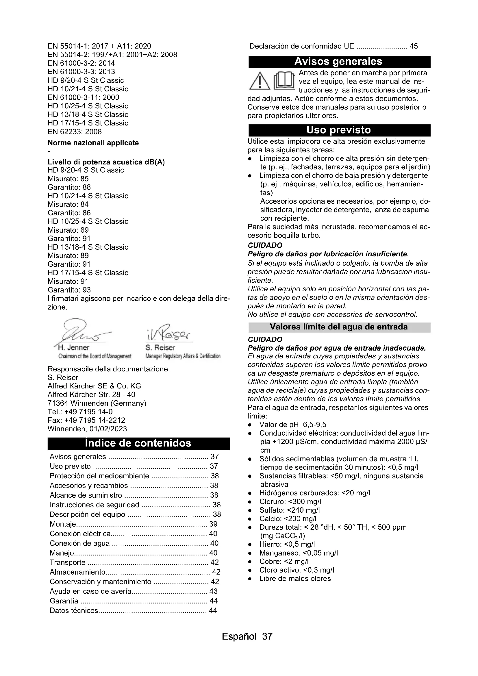 Livello di potenza acustica dB(A) HD 9/20-4 S St Classic Misurato: 85 Garantito: 88 HD 10/21-4 S St Classic Misurato: 84 Garantito: 86 HD 10/25-4 S St Classic Misurato: 89 Garantito: 91 HD 13/18-4 S St Classic Misurato: 89 Garantito: 91 HD 17/15-4 S St Classic Misurato: 91 Garantito: 93 I firmatari agiscono per incarico e con delega della dire- zione. Responsabile della documentazione: S. Reiser Alfred Kärcher SE & Co. KG Alfred-Kärcher-Str. 28 - 40 71364 Winnenden (Germany) Tel.: +49 7195 14-0 Fax: +49 7195 14-2212 Winnenden, 01/02/2023 Índice de contenidos Avisos generales Antes de poner en marcha por primera vez el equipo, lea este manual de ins- trucciones y las instrucciones de seguri- dad adjuntas. Actúe conforme a estos documentos. Conserve estos dos manuales para su uso posterior o para propietarios ulteriores. Uso previsto Utilice esta limpiadora de alta presión exclusivamente para las siguientes tareas: ● Limpieza con el chorro de alta presión sin detergen- te (p. ej., fachadas, terrazas, equipos para el jardín) ● Limpieza con el chorro de baja presión y detergente (p. ej., máquinas, vehículos, edificios, herramien- tas) Accesorios opcionales necesarios, por ejemplo, do- sificadora, inyector de detergente, lanza de espuma con recipiente. Para la suciedad más incrustada, recomendamos el ac- cesorio boquilla turbo. CUIDADO Peligro de daños por lubricación insuficiente. Si el equipo está inclinado o colgado, la bomba de alta presión puede resultar dañada por una lubricación insu- ficiente. Utilice el equipo solo en posición horizontal con las pa- tas de apoyo en el suelo o en la misma orientación des- pués de montarlo en la pared. No utilice el equipo con accesorios de servocontrol. Valores límite del agua de entrada CUIDADO Peligro de daños por agua de entrada inadecuada. El agua de entrada cuyas propiedades y sustancias contenidas superen los valores límite permitidos provo- ca un desgaste prematuro o depósitos en el equipo. Utilice únicamente agua de entrada limpia (también agua de reciclaje) cuyas propiedades y sustancias con- tenidas estén dentro de los valores límite permitidos. Para el agua de entrada, respetar los siguientes valores límite: ● Valor de pH: 6,5-9,5 ● Conductividad eléctrica: conductividad del agua lim- pia +1200 µS/cm, conductividad máxima 2000 µS/