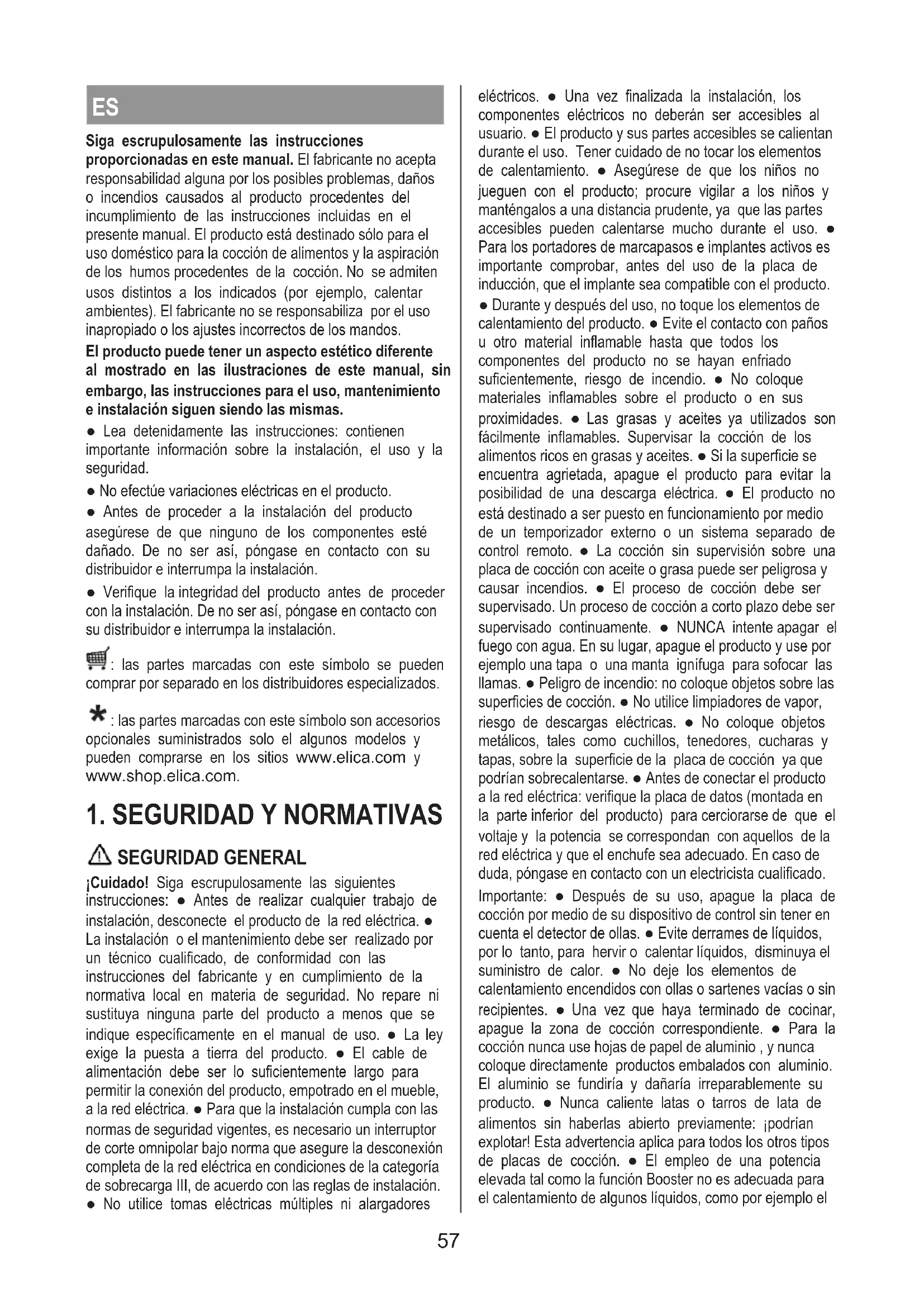 Als de storing na het uitvoeren van deze controles nog steeds aanwezig is, neem dan contact op met de dichtstbij- zijnde Servicedienst. 56ES Siga escrupulosamente las instrucciones proporcionadas en este manual. El fabricante no acepta responsabilidad alguna por los posibles problemas, daños o incendios causados al producto procedentes del incumplimiento de las instrucciones incluidas en el presente manual. El producto está destinado sólo para el uso doméstico para la cocción de alimentos y la aspiración de los humos procedentes de la cocción. No se admiten usos distintos a los indicados (por ejemplo, calentar ambientes). El fabricante no se responsabiliza por el uso inapropiado o los ajustes incorrectos de los mandos. El producto puede tener un aspecto estético diferente al mostrado en las ilustraciones de este manual, sin embargo, las instrucciones para el uso, mantenimiento e instalación siguen siendo las mismas. ● Lea detenidamente las instrucciones: contienen importante información sobre la instalación, el uso y la seguridad. ● No efectúe variaciones eléctricas en el producto. ● Antes de proceder a la instalación del producto asegúrese de que ninguno de los componentes esté dañado. De no ser así, póngase en contacto con su distribuidor e interrumpa la instalación. ● Verifique la integridad del producto antes de proceder con la instalación. De no ser así, póngase en contacto con su distribuidor e interrumpa la instalación. : las partes marcadas con este símbolo se pueden comprar por separado en los distribuidores especializados. : las partes marcadas con este símbolo son accesorios opcionales suministrados solo el algunos modelos y pueden comprarse en los sitios www.elica.com y www.shop.elica.com.