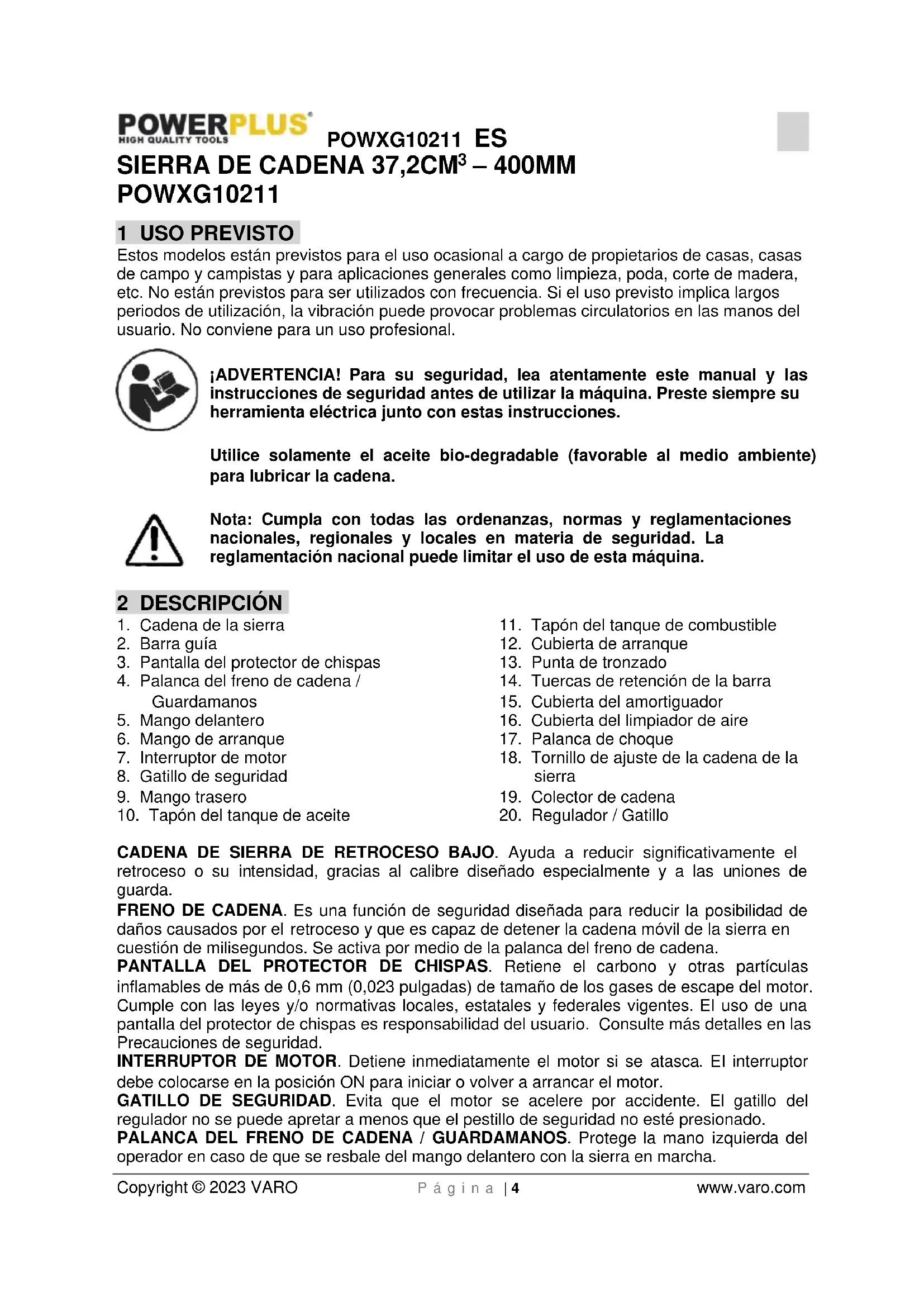 ADVERTENCIA: NO arranque el motor de la sierra hasta que la unidad esté preparada. La nueva sierra de cadena necesitará que ajuste la cadena, rellene el tanque de combustible con la mezcla correcta y que rellene el tanque de aceite con aceite lubricante antes de que la unidad esté lista para funcionar. Lea por completo el manual del usuario antes de intentar utilizar la unidad. Preste atención especial a todas las precauciones de seguridad. El manual del usuario es una guía de referencia y un manual pensados para ofrecerle la información general de montaje, funcionamiento y mantenimiento de la sierra.POWXG10211 ES Copyright © 2023 VARO P á g i n a | 10 www.varo.com