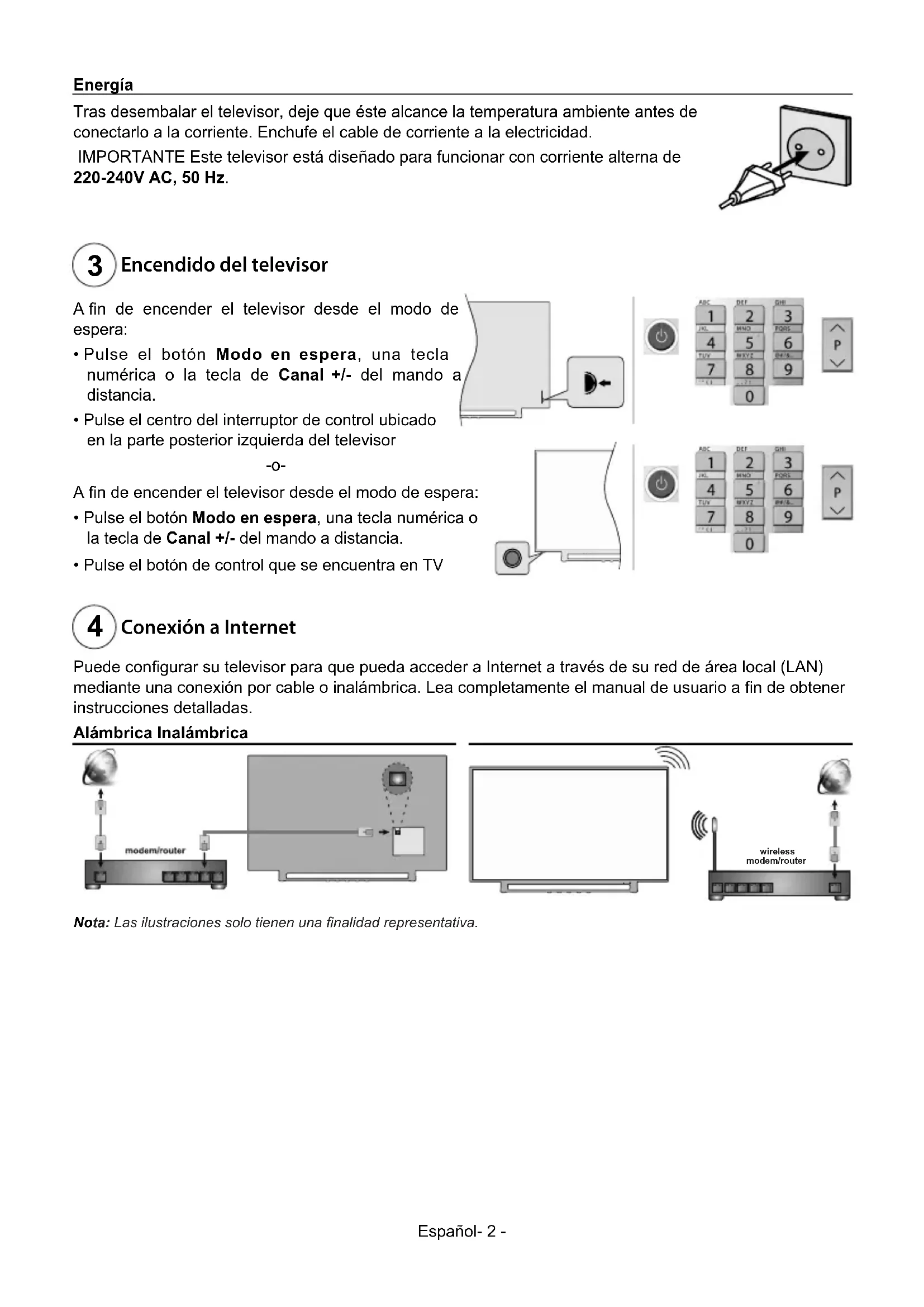 Español- 2 - Energía Tras desembalar el televisor, deje que éste alcance la temperatura ambiente antes de conectarlo a la corriente. Enchufe el cable de corriente a la electricidad. IMPORTANTE Este televisor está diseñado para funcionar con corriente alterna de 220-240V AC, 50 Hz. Encendido del televisor