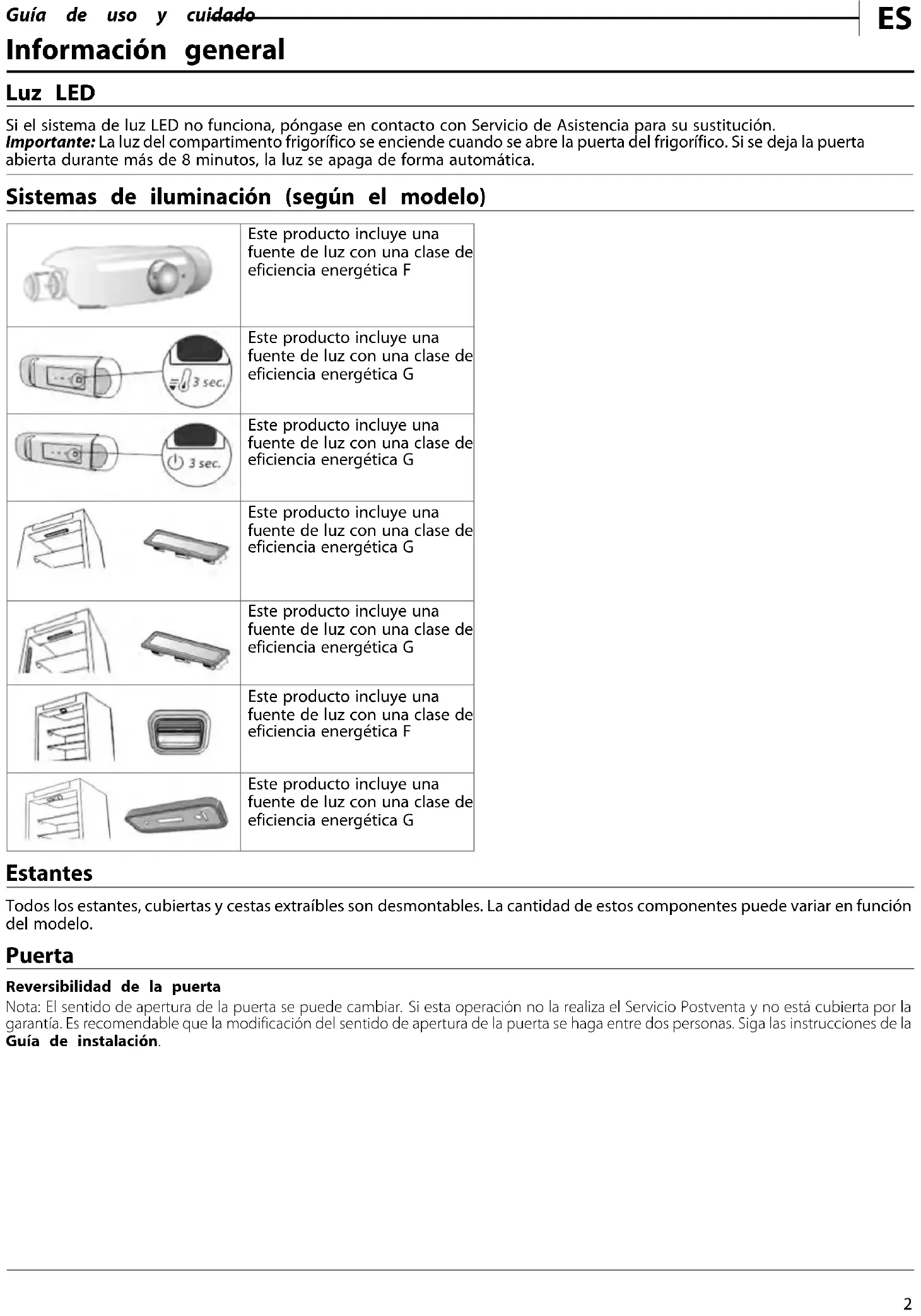 Información general Luz LED Si el sistema de luz LED no funciona, póngase en contacto con Servicio de Asistencia para su sustitución. Importante: La luz del compartimento frigorífico se enciende cuando se abre la puerta del frigorífico. Si se deja la puerta abierta durante más de 8 minutos, la luz se apaga de forma automática. Sistemas de iluminación (según el modelo) Este producto incluye una fuente de luz con una clase de eficiencia energética F Este producto incluye una fuente de luz con una clase de eficiencia energética G Este producto incluye una fuente de luz con una clase de eficiencia energética G Este producto incluye una fuente de luz con una clase de eficiencia energética G Este producto incluye una fuente de luz con una clase de eficiencia energética G Este producto incluye una fuente de luz con una clase de eficiencia energética F Este producto incluye una fuente de luz con una clase de eficiencia energética G Estantes Todos los estantes, cubiertas y cestas extraíbles son desmontables. La cantidad de estos componentes puede variar en función del modelo. Puerta Reversibilidad de la puerta Nota: El sentido de apertura de la puerta se puede cambiar. Si esta operación no la realiza el Servicio Postventa y no está cubierta por la garantía. Es recomendable que la modificación del sentido de apertura de la puerta se haga entre dos personas. Siga las instrucciones de la Guía de instalación.Guía de uso y cuidado