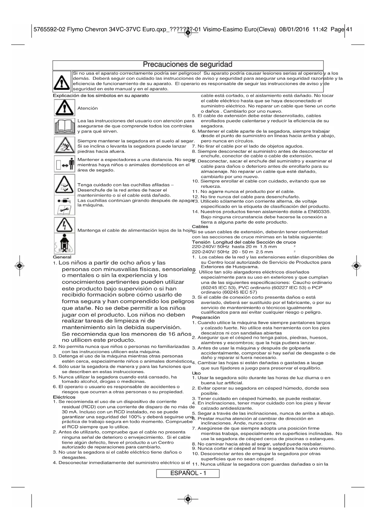 Forsigtig! Husqvarna UK Ltd. kan under garantien ikke påtage sig ansvaret for fejl, der helt eller delvist, direkte eller indirekte skyldes monteringen af reservedele eller ekstradele, der ikke er fremstillet eller godkendt af Husqvarna UK Ltd., eller at maskinen er blevet modificeret på nogen måde. 5765592-02 Flymo Chevron 34VC-37VC Euro.qxp_???????-01 Visimo-Easimo Euro(Cleva) 08/01/2016 11:42 Page 40Precauciones de seguridad Si no usa el aparato correctamente podría ser peligroso! Su aparato podría causar lesiones serias al operario y a los demás. Deberá seguir con cuidado las instrucciones de aviso y seguridad para asegurar una seguridad razonable y la eficiencia de funcionamiento de su aparato. El operario es responsable de seguir las instrucciones de aviso y de seguridad en este manual y en el aparato. Explicación de los símbolos en su aparato Atención Lea las instrucciones del usuario con atención para asegurarse de que comprende todos los controles y para qué sirven. Siempre mantener la segadora en el suelo al segar. Si se inclina o levanta la segadora puede lanzar piedras hacia afuera. Mantener a espectadores a una distancia. No segar mientras haya niños o animales domésticos en el área de segado. Tenga cuidado con las cuchillas afiladas – Desenchufe de la red antes de hacer el mantenimiento o si el cable está dañado. Las cuchillas continúan girando después de apagar la máquina. Mantenga el cable de alimentación lejos de la hoja. General