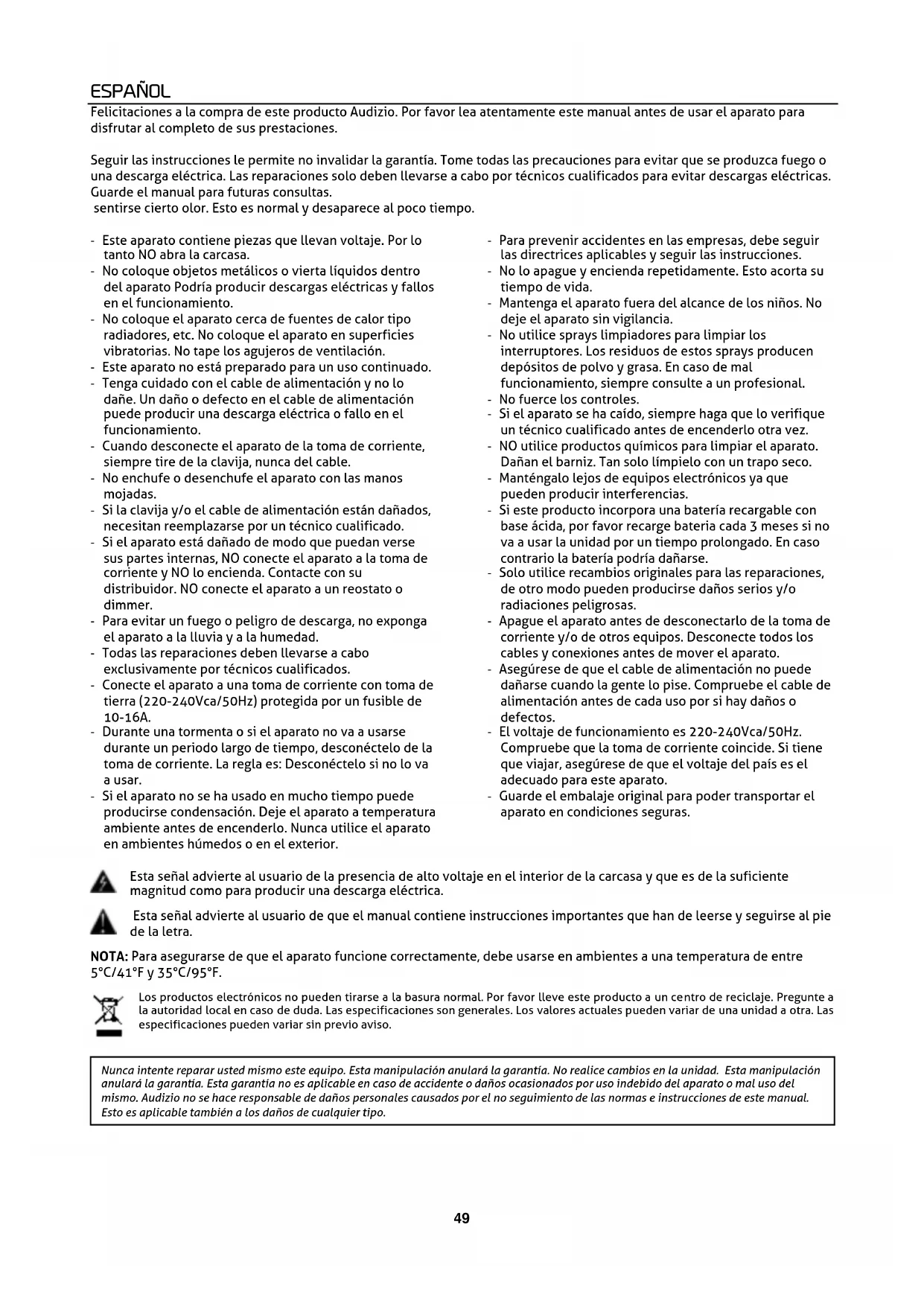 Nunca intente reparar usted mismo este equipo. Esta manipulación anulará la garantía. No realice cambios en la unidad. Esta manipulación anulará la garantía. Esta garantía no es aplicable en caso de accidente o daños ocasionados por uso indebido del aparato o mal uso del mismo. Audizio no se hace responsable de daños personales causados por el no seguimiento de las normas e instrucciones de este manual. Esto es aplicable también a los daños de cualquier tipo.50