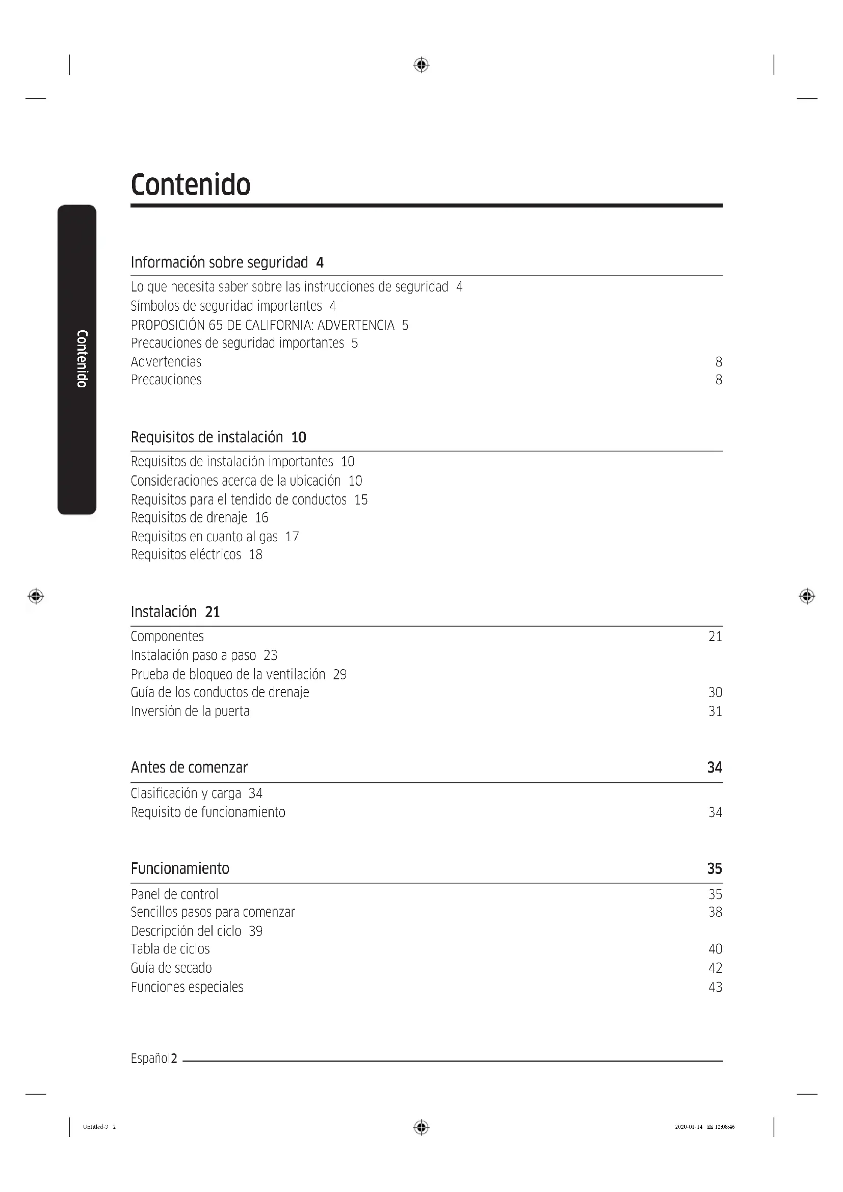 Precauciones de seguridad importantes 5 Advertencias 8 Precauciones 8 Requisitos de instalación 10 Requisitos de instalación importantes 10 Consideraciones acerca de la ubicación 10 Requisitos para el tendido de conductos 15 Requisitos de drenaje 16 Requisitos en cuanto al gas 17 Requisitos eléctricos 18 Instalación 21 Componentes 21 Instalación paso a paso 23 Prueba de bloqueo de la ventilación 29 Guía de los conductos de drenaje 30 Inversión de la puerta 31 Antes de comenzar 34 Clasicación y carga 34 Requisito de funcionamiento 34 Funcionamiento 35 Panel de control 35 Sencillos pasos para comenzar 38 Descripción del ciclo 39 Tabla de ciclos 40 Guía de secado 42 Funciones especiales 43 Untitled-3 2 2020-01-14 12:08:46Español 3 Contenido Mantenimiento 46 Limpieza 46 Solución de problemas 47 Vericaciones 47 Códigos de información 50 Especicaciones 52 Tabla de indicaciones sobre telas 52 Protección del medio ambiente 53 Hoja de especicaciones 54 Untitled-3 3 2020-01-14 12:08:46CONSERVE ESTAS INSTRUCCIONES Español4 Información sobre seguridad Felicitaciones por la compra de la nueva secadora Samsung. Este manual contiene información importante acerca de la instalación, el uso y el cuidado del electrodoméstico. Lea detenidamente estas instrucciones a n de aprovechar al máximo los múltiples benecios y funciones de la secadora. Lo que necesita saber sobre las instrucciones de seguridad Lea este manual detenidamente para aprender a utilizar con seguridad y ecacia todas las características y funciones de su nuevo electrodoméstico. Conserve el manual en un lugar seguro cerca del electrodoméstico para consultas futuras. Utilice este electrodoméstico solo para el propósito para el que fue destinado como se describe en este manual. Las advertencias y las instrucciones de seguridad importantes de este manual no cubren todas las posibles condiciones y situaciones que pueden ocurrir. Es su responsabilidad actuar con sentido común, precaución y cuidado cuando instale, realice el mantenimiento y ponga en funcionamiento la secadora. Puesto que las siguientes instrucciones de funcionamiento sirven para varios modelos, las características de su secadora pueden diferir ligeramente de las que se describen en este manual y es posible que no todos los signos de advertencia sean aplicables. Si tiene alguna consulta o duda, comuníquese con el centro de servicio más cercano o busque ayuda e información en línea en www.samsung.com. Símbolos de seguridad importantes Los íconos y las señales incluidas en este manual del usuario signican lo siguiente: ADVERTENCIA Peligros o prácticas inseguras que podrían causar lesiones físicas graves o la muerte y/o daños materiales. PRECAUCIÓN Peligros o prácticas inseguras que podrían causar lesiones físicas y/o daños materiales. NOTA Indica que existe el riesgo de lesiones físicas o daños materiales. Información sobre seguridad Untitled-3 4 2020-01-14 12:08:46CONSERVE ESTAS INSTRUCCIONES Español 5 Información sobre seguridad Estas señales de advertencia están aquí para evitar que usted u otras personas sufran lesiones. Siga las instrucciones completamente. Después de leer este manual, guárdelo en un lugar seguro para consultas futuras. Lea todas las instrucciones antes de usar el electrodoméstico. Al igual que con cualquier equipo que usa electricidad y piezas movibles, existen riesgos potenciales. Para usar este electrodoméstico en forma segura, familiarícese con su funcionamiento y manéjelo con cuidado cuando lo use. ADVERTENCIA - Riesgo de incendio