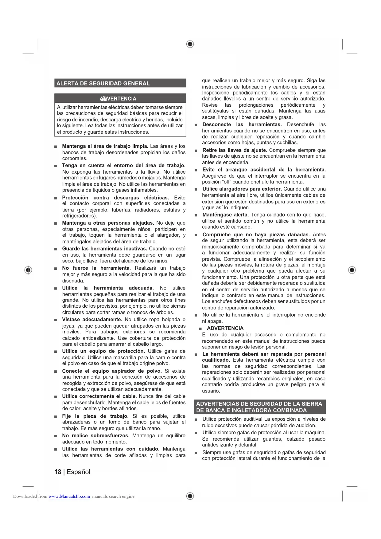 19 Español | herramienta eléctrica o cuando ésta desprenda polvo. Si la superficie de trabajo es polvorienta, use también una careta específica. Ŷ Esta máquina está equipada con un cable de alimentación especialmente configurado. Si el cable de alimentación está dañado o defectuoso, debe ser sustituido por el fabricante o por un agente de reparación autorizado. Ŷ Antes de comenzar cualquier operación, compruebe que todos los botones de bloqueo y agarraderas están apretados. Ŷ Não utilize a serra sem as guardas na posição correta, especialmente depois de alterar o modo. Conserve as guardas em bom estado de funcionamento e manutenção. Ŷ Nunca coloque las manos en el área de la lámina cuando la sierra está conectada a la fuente de alimentación. Ŷ Nunca intente parar una máquina en movimiento repentinamente enclavando una herramienta u otros medios contra la lámina pues de este modo podrá causar accidentes graves sin intención. Ŷ Antes de utilizar cualquier accesorio, consulte el manual de instrucciones. El uso inadecuado de un accesorio puede causar daños. Ŷ No altere ni modifique la unidad con respecto a su diseño o función original. Ŷ Assegure que quaisquer espaçadores e fusos com anéis usados são adequados para o fim, de acordo com este manual. Ŷ Seleccione la lámina correcta para el material que va cortar. Ŷ Observe la velocidad máxima marcada en la lámina de la sierra. Assegure que a velocidade indicada no disco da serra é pelo menos igual à velocidade indicada na serra. Ŷ Use un soporte o guantes de protección al maniobrar una lámina de sierra. Ŷ Verifique que la lámina de la sierra está correctamente montada antes utilizarla. Ŷ Compruebe que la lámina gira en la dirección correcta. Mantenga la lámina afilada. Ŷ Considere el uso de hojas especialmente diseñadas para la reducción de ruido. Ŷ Levante la lámina del corte en la pieza de trabajo antes de abrir el interruptor. Ŷ Compruebe que el brazo está firmemente fijado cuando vaya a realizar cortes cónicos. Ŷ Assegure que o braço está bem fixado na posição de funcionamento no modo de serra circular. Ŷ Asegúrese de que la mesa de la sierra está fijada de manera segura a la altura elegida. Ŷ No introduzca nada a la fuerza contra el abanico para fijar el eje del motor. Ŷ La protección de la lámina en su sierra se levantará automáticamente cuando el brazo es conducido hacia abajo, este baja sobre la lámina cuando el brazo es levantado. La protección puede ser levantada manualmente al instalar o retirar láminas de sierra o al inspeccionar la sierra. Nunca levante la protección de la lámina manualmente a menos que la sierra esté desconectada. Ŷ Mantenga el área alrededor de la máquina bien conservada y sin materiales sueltos, tales como pedazos de piezas y desperdicios. Ŷ Verifique periódicamente si las aberturas de aire del motor están limpias y libres de astillas. Ŷ Desconecte la máquina de la red antes de realizar cualquier operación de mantenimiento o al cambiar la hoja. Ŷ Nunca realice ningún trabajo de limpieza o de mantenimiento cuando la máquina se encuentra aún en funcionamiento y si la cabeza no está en la posición de descanso. Ŷ Siempre que sea posible, coloque la máquina sobre un banco y verifique la seguridad de la fijación al mismo. Ŷ Al realizar cortes de inglete, bisel o de inglete compuesta, ajuste la cerca del inglete deslizante de modo que garantice el espacio correcto para la aplicación. Ŷ Absténgase de remover sobras cortadas u otras partes de la pieza de trabajo del área de corte mientras la sierra está en funcionamiento. Ŷ Antes de trabajar, compruebe que la máquina está situada en una superficie uniforme con suficiente estabilidad. Ŷ Antes de empezar a trabajar, haga un corte de prueba con el motor apagado para comprobar la posición de la lámina, el funcionamiento de las protecciones con respecto a otras piezas de la máquina y la pieza de trabajo. Ŷ Nunca corte aleación ligera, especialmente magnesio. Ŷ No utilice ningún disco abrasivo o de diamante. Ŷ En caso de accidente o de falla de la máquina, desconecte inmediatamente la máquina de la fuente de alimentación. Ŷ Reporte la anomalía y señale la máquina para evitar que otras personas usen la máquina averiada. Ŷ Cuando una lámina de sierra está bloqueada debido a una fuerza de alimentación anormal durante el corte, apague la máquina y desconéctela de la fuente de alimentación. Retire la pieza de trabajo y asegúrese de que la lámina de la sierra se mueve libremente. Conecte la máquina e inicie una nueva operación de corte con fuerza de aceleración reducida. Ŷ Verifique que su posición se encuentra siempre a la izquierda o a la derecha de la línea de corte. Ŷ Proporcione una iluminación general y localizada adecuada a fin de evitar efectos estroboscópicos y otros peligros. Ŷ Compruebe que el operador está correctamente capacitado para la utilización, ajuste y funcionamiento de la máquina. Ŷ Desconecte la máquina cuando quede sin supervisión. Ŷ Conecte la sierra al colector de polvo cuando esté serrando madera. Tenga siempre en cuenta los factores que influyen en la exposición del polvo, como el tipo de material a trabajar (los tableros de viruta de Downloaded from www.Manualslib.com manuals search engine20 | Español madera produce más polvo que la madera), el ajuste de la hoja de la sierra, el ajuste de la extracción local, así como las cubiertas protectoras, los deflectores y las tolvas, así como la velocidad de aire del polvo Ŷ Mantenga la lámina de la sierra afilada y correctamente montada. Ŷ No intente hacer funcionar la herramienta en voltaje diferente al designado. Ŷ No aplique lubricantes en la hoja cuando esté en funcionamiento. Ŷ Confirme que no hay nadie detrás de la máquina. Ŷ Para su propia seguridad, siempre monte la máquina en una mesa de trabajo fijada con tornillos. Ŷ Utilice hojas 