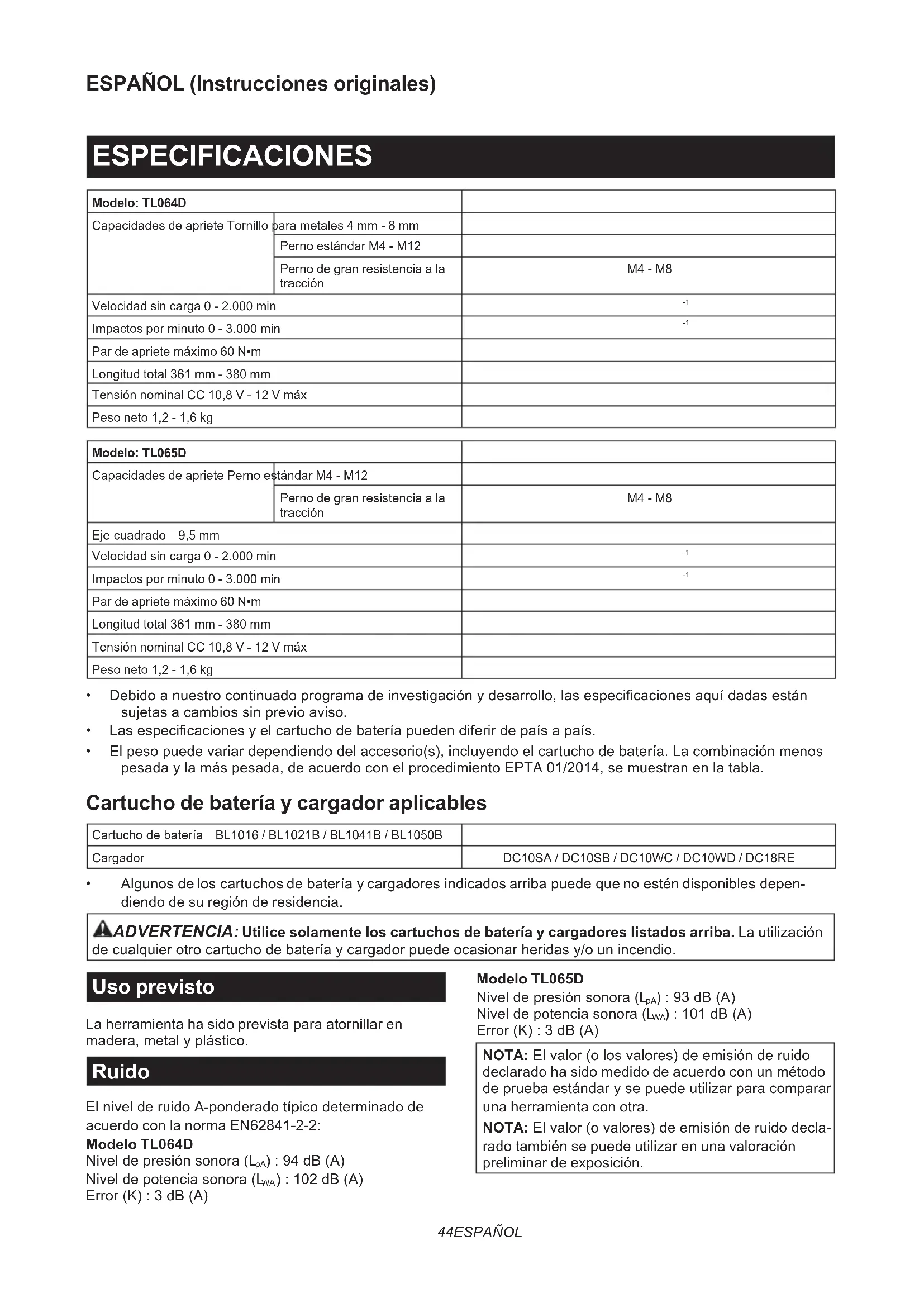 - Algunosdeloscartuchosdebateríaycargadoresindicadosarribapuedequenoesténdisponiblesdepen- diendo de su región de residencia. ADVERTENCIA: Utilice solamente los cartuchos de batería y cargadores listados arriba. La utilización decualquierotrocartuchodebateríaycargadorpuedeocasionarheridasy/ounincendio. Uso previsto La herramienta ha sido prevista para atornillar en madera,metalyplástico. Ruido ElnivelderuidoA-ponderadotípicodeterminadode acuerdo con la norma EN62841-2-2: Modelo TL064D Niveldepresiónsonora(L