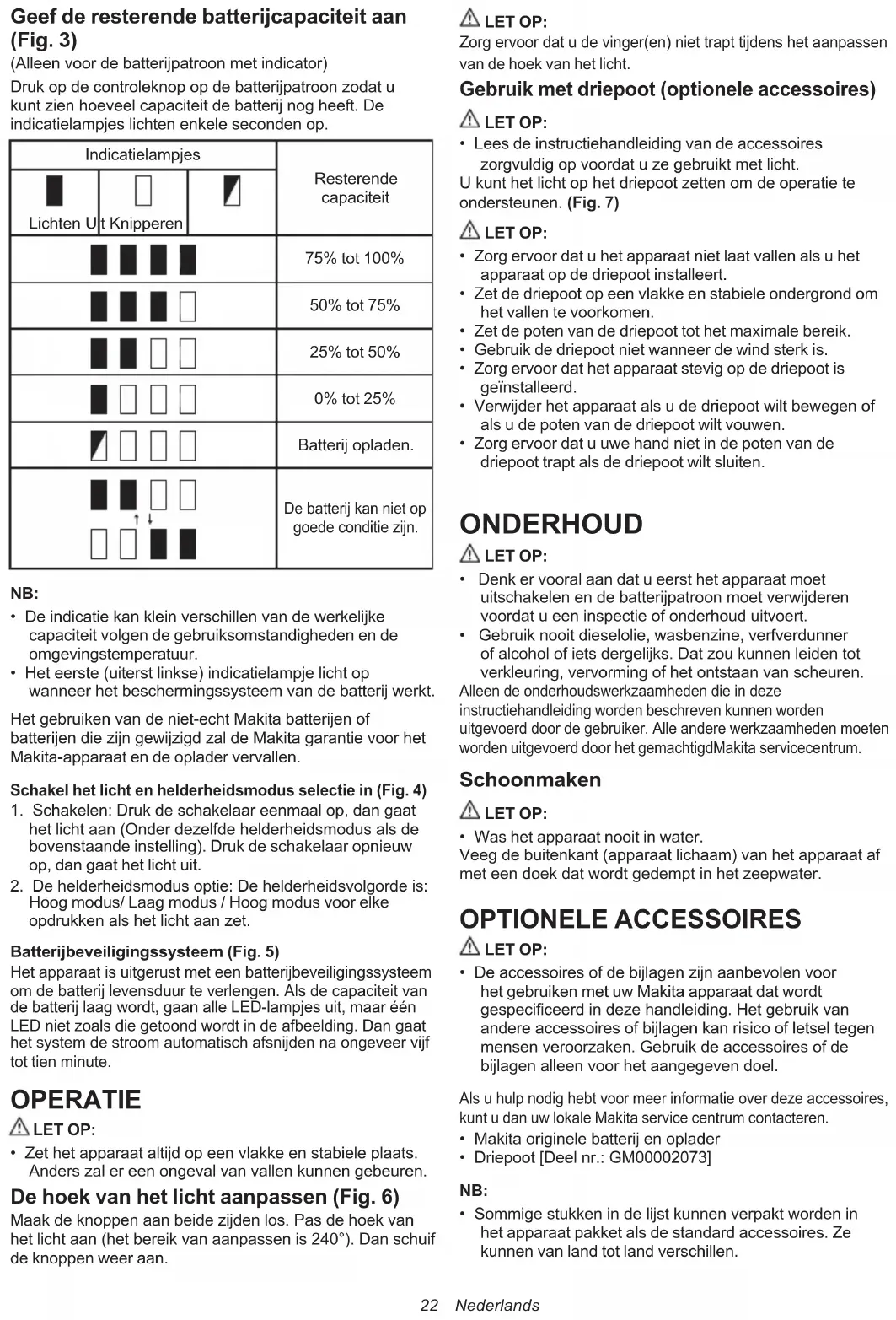 Interruptor:Presioneelinterruptorunavez,laluzseenciende (conelmismotipodebrilloqueseseleccionólaúltimavez). Presioneelinterruptornuevamente,laluzseapaga. 2.Seleccióndetipodebrillo:Lasecuenciadebrilloes: Modoalto/Modobajo/Modoaltoparacadauno presionecuandolaluzesteencendida. Sistema de protección de la batería (Fig.5) Elaparatoestáequipadoconunsistemadeprotecciónde batería para extender la vida de la batería. Cuando la batería estebaja,laslucesLEDseapagaranconlaexcepcióndeuna LEDcomoestáilustrado.Despuésaproximadamentecincoo diezminutosdespués,elsistemaseapagaraautomáticamente. OPERACIÓN PRECAUCIÓN: