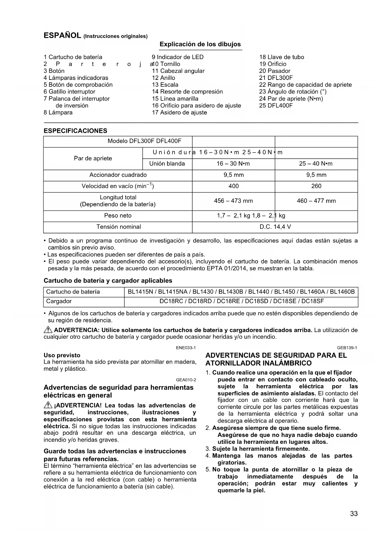 Alleen voor Europese landen De EG-verklaring van conformiteit is bijgesloten als Aanhangsel A bij deze gebruiksaanwijzing.33 ESPAÑOL (Instrucciones originales) Explicación de los dibujos 1 Cartucho de batería 2Parte roja 3 Botón 4 Lámparas indicadoras 5 Botón de comprobación 6 Gatillo interruptor 7 Palanca del interruptor de inversión 8 Lámpara 9 Indicador de LED 10 Tornillo 11 Cabezal angular 12 Anillo 13 Escala 14 Resorte de compresión 15 Línea amarilla 16 Orificio para asidero de ajuste 17 Asidero de ajuste 18 Llave de tubo 19 Orificio 20 Pasador 21 DFL300F 22 Rango de capacidad de apriete 23 Ángulo de rotación (°) 24 Par de apriete (N•m) 25 DFL400F ESPECIFICACIONES