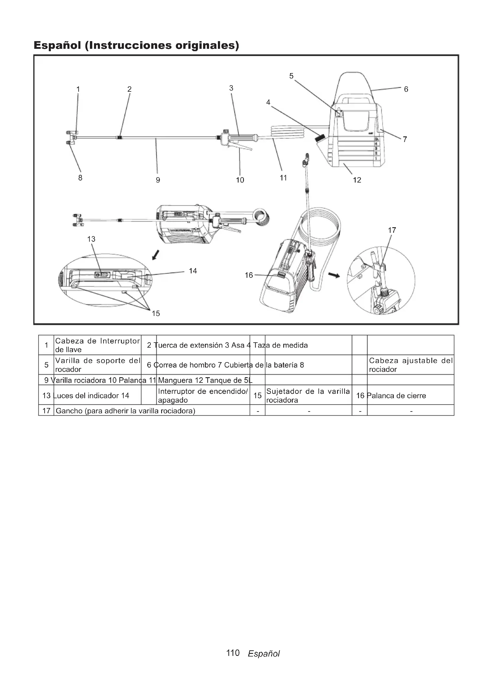 Varilla de soporte del rocador 6 Correa de hombro 7 Cubierta de la batería 8 Cabeza ajustable del rociador 9 Varilla rociadora 10 Palanca 11 Manguera 12 Tanque de 5L 13 Luces del indicador 14 Interruptor de encendido/ apagado