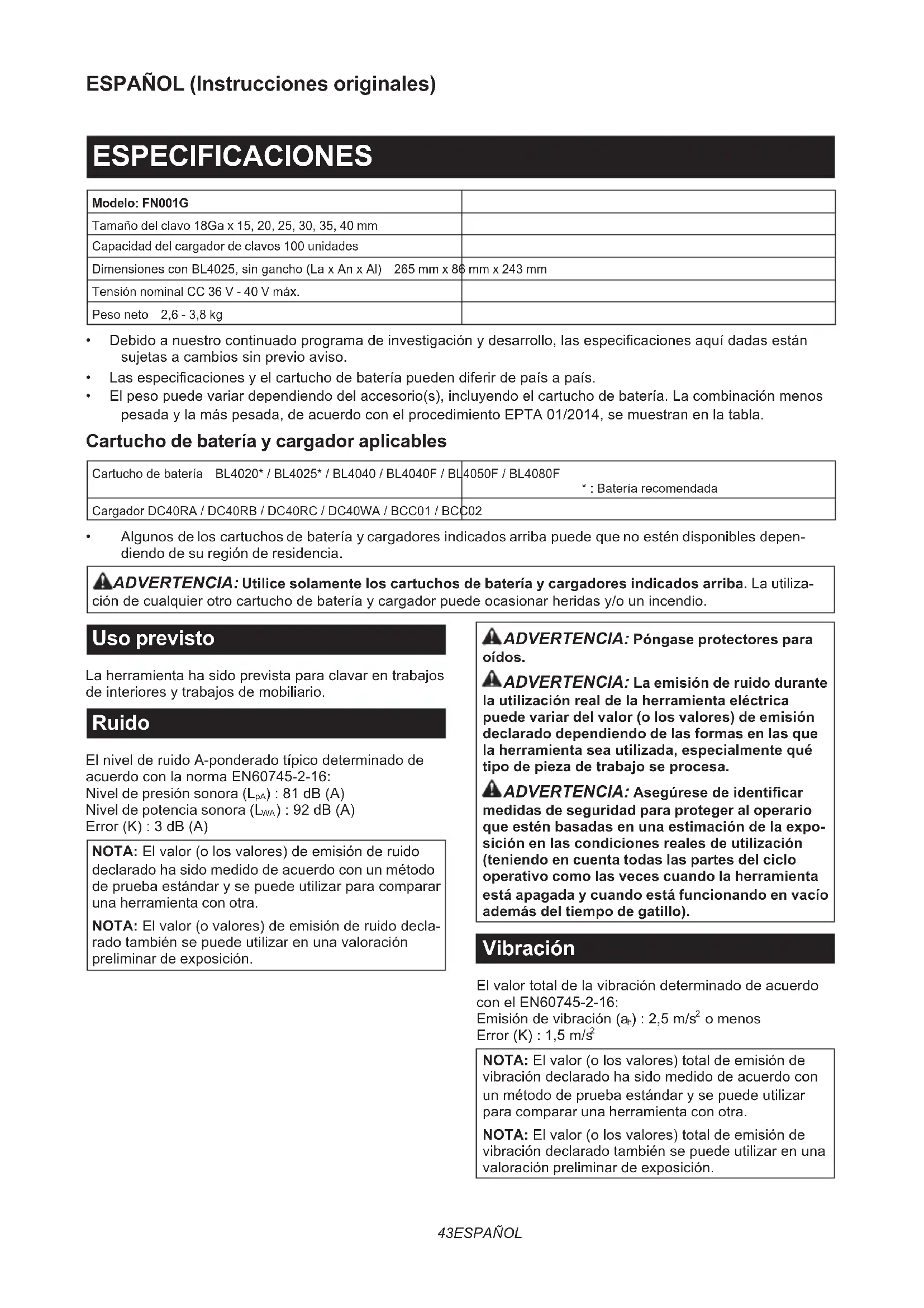 NOTA:Elvalor(olosvalores)totaldeemisiónde vibracióndeclaradohasidomedidodeacuerdocon unmétododepruebaestándarysepuedeutilizar para comparar una herramienta con otra. NOTA:Elvalor(olosvalores)totaldeemisiónde vibracióndeclaradotambiénsepuedeutilizarenuna valoración preliminar de exposición.44 ESPAÑOL ADVERTENCIA: La emisión de vibración durante la utilización real de la herramienta eléc- trica puede variar del valor (o los valores) de emi- sión declarado dependiendo de las formas en las que la herramienta sea utilizada, especialmente qué tipo de pieza de trabajo se procesa. ADVERTENCIA: Asegúrese de identicar medidas de seguridad para proteger al operario que estén basadas en una estimación de la expo- sición en las condiciones reales de utilización (teniendo en cuenta todas las partes del ciclo operativo como las veces cuando la herramienta está apagada y cuando está funcionando en vacío además del tiempo de gatillo). Declaraciones de conformidad Para países europeos solamente Las declaraciones de conformidad están incluidas comoAnexoAdeestemanualdeinstrucciones. ADVERTENCIAS DE SEGURIDAD Advertencias de seguridad para herramientas eléctricas en general ADVERTENCIA Lea todas las advertencias de seguridad, instrucciones, ilustraciones y especi- caciones provistas con esta herramienta eléctrica. Sinosiguetodaslasinstruccionesindicadasabajo, podrá resultar en una descarga eléctrica, un incendio y/oheridasgraves. Guarde todas las advertencias e instrucciones para futuras referencias. Eltérmino“herramientaeléctrica”enlasadvertencias sereereasuherramientaeléctricadefunciona- mientoconconexiónalaredeléctrica(concable)o herramientaeléctricadefuncionamientoabatería(sin cable). Advertencias de seguridad para la clavadora inalámbrica
