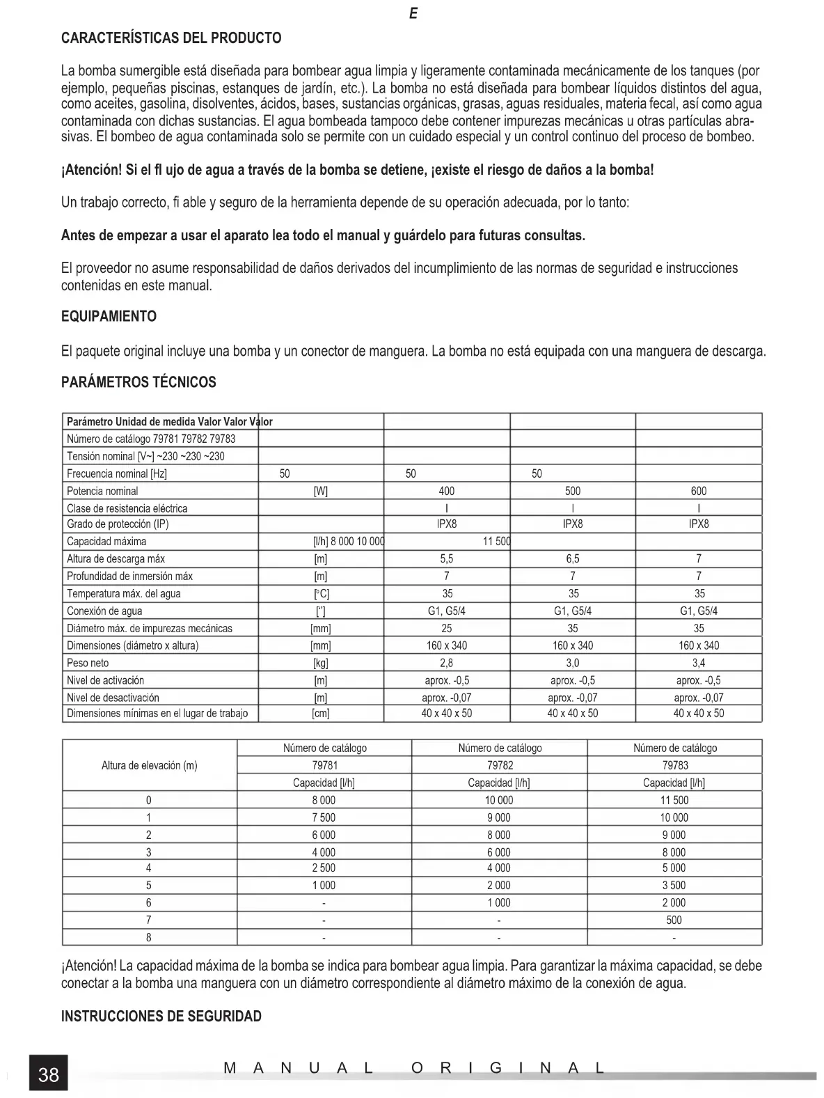 Parámetro Unidad de medida Valor Valor Valor Número de catálogo 79781 79782 79783 Tensión nominal [V~] ~230 ~230 ~230 Frecuencia nominal [Hz] 50 50 50 Potencia nominal [W] 400 500 600 Clase de resistencia eléctrica I I I Grado de protección (IP) IPX8 IPX8 IPX8 Capacidad máxima [l/h] 8 000 10 000 11 500 Altura de descarga máx [m] 5,5 6,5 7 Profundidad de inmersión máx [m] 7 7 7 Temperatura máx. del agua [