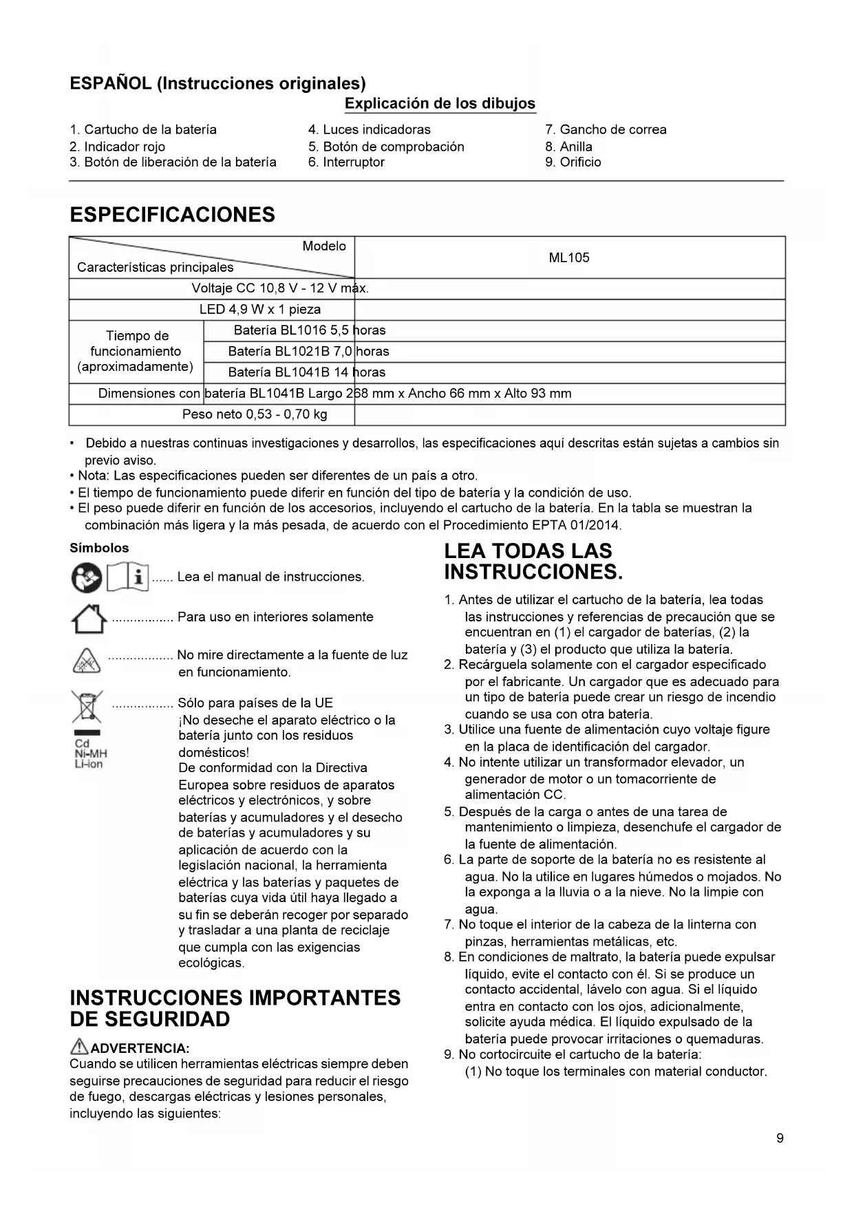 - El peso puede diferir en función de los accesorios, incluyendo el cartucho de la batería. En la tabla se muestran la combinación más ligera y la más pesada, de acuerdo con el Procedimiento EPTA 01/2014. Símbolos ...... Lea el manual de instrucciones. ................. Para uso en interiores solamente .................. No mire directamente a la fuente de luz en funcionamiento. ................. Sólo para países de la UE ¡No deseche el aparato eléctrico o la batería junto con los residuos domésticos! De conformidad con la Directiva Europea sobre residuos de aparatos eléctricos y electrónicos, y sobre baterías y acumuladores y el desecho de baterías y acumuladores y su aplicación de acuerdo con la legislación nacional, la herramienta eléctrica y las baterías y paquetes de baterías cuya vida útil haya llegado a su fin se deberán recoger por separado y trasladar a una planta de reciclaje que cumpla con las exigencias ecológicas. INSTRUCCIONES IMPORTANTES DE SEGURIDAD ADVERTENCIA: Cuando se utilicen herramientas eléctricas siempre deben seguirse precauciones de seguridad para reducir el riesgo de fuego, descargas eléctricas y lesiones personales, incluyendo las siguientes: