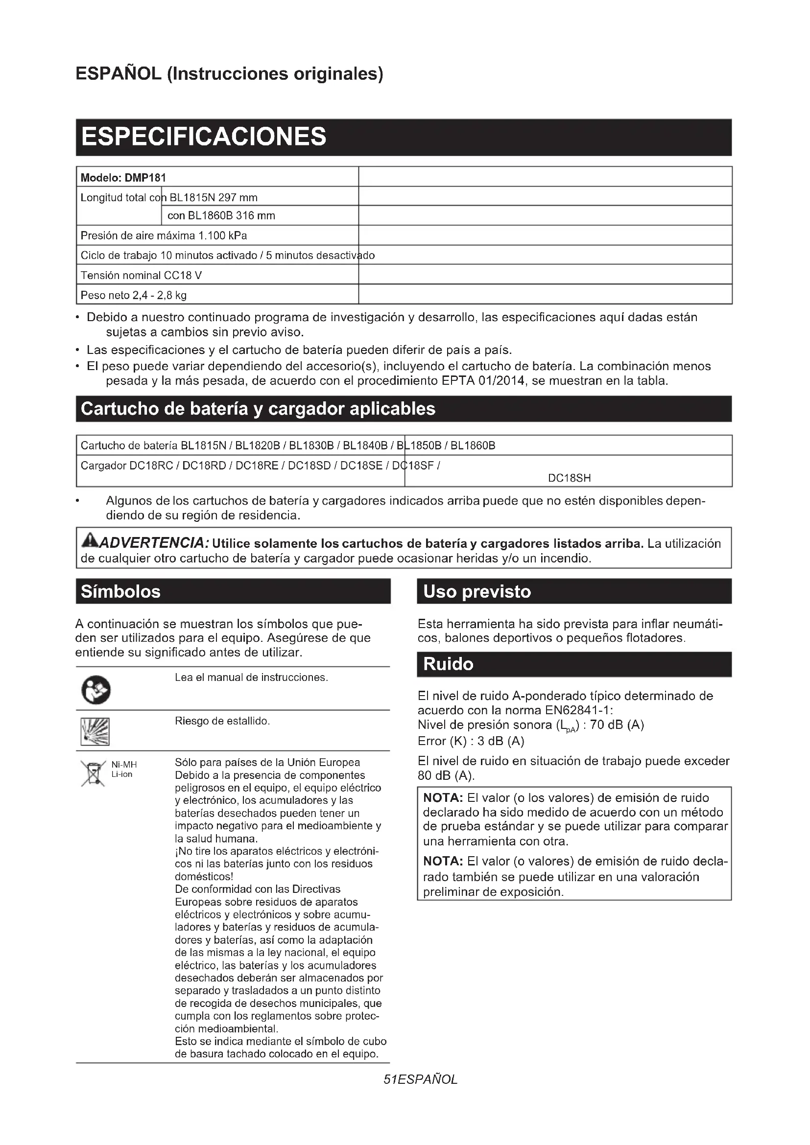 ESPAÑOL (Instrucciones originales) ESPECIFICACIONES Modelo: DMP181 Longitud total con BL1815N 297 mm con BL1860B 316 mm Presión de aire máxima 1.100 kPa Ciclo de trabajo 10 minutos activado / 5 minutos desactivado Tensión nominal CC18 V Peso neto 2,4 - 2,8 kg