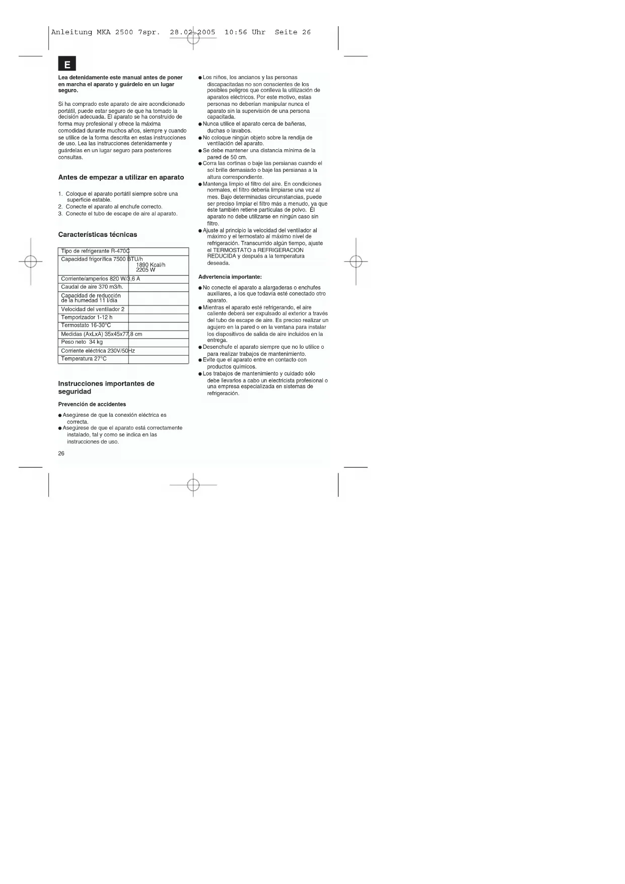 Anleitung MKA 2500 7spr. 28.02.2005 10:56 Uhr Seite 25Lea detenidamente este manual antes de poner en marcha el aparato y guárdelo en un lugar seguro. Si ha comprado este aparato de aire acondicionado portátil, puede estar seguro de que ha tomado la decisión adecuada. El aparato se ha construido de forma muy profesional y ofrece la máxima comodidad durante muchos años, siempre y cuando se utilice de la forma descrita en estas instrucciones de uso. Lea las instrucciones detenidamente y guárdelas en un lugar seguro para posteriores consultas. Antes de empezar a utilizar en aparato