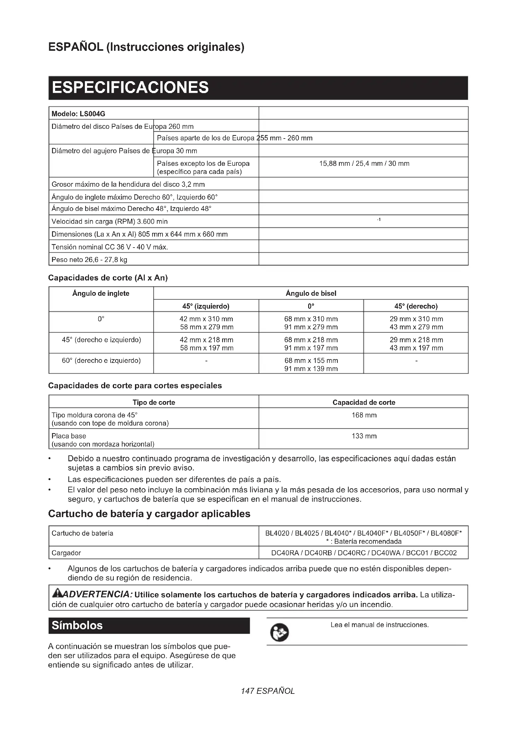 - Originele Makita accu’s en acculaders OPMERKING: Sommige items op de lijst kunnen zijn inbegrepen in de doos van het gereedschap als standaard toebehoren. Deze kunnen van land tot land verschillen.147 ESPAÑOL ESPAÑOL (Instrucciones originales) ESPECIFICACIONES Modelo: LS004GDiámetro del disco Países de Europa 260 mmPaíses aparte de los de Europa 255 mm - 260 mmDiámetro del agujero Países de Europa 30 mmPaíses excepto los de Europa (especíco para cada país)15,88 mm / 25,4 mm / 30 mmGrosor máximo de la hendidura del disco 3,2 mmÁngulo de inglete máximo Derecho 60°, Izquierdo 60°Ángulo de bisel máximo Derecho 48°, Izquierdo 48°Velocidad sin carga (RPM) 3.600 min Dimensiones (La x An x Al) 805 mm x 644 mm x 660 mmTensión nominal CC 36 V - 40 V máx.Peso neto 26,6 - 27,8 kg Capacidades de corte (Al x An) Ángulo de inglete Ángulo de bisel45° (izquierdo) 0° 45° (derecho)0° 42 mm x 310 mm58 mm x 279 mm68 mm x 310 mm91 mm x 279 mm29 mm x 310 mm43 mm x 279 mm45° (derecho e izquierdo) 42 mm x 218 mm58 mm x 197 mm68 mm x 218 mm91 mm x 197 mm29 mm x 218 mm43 mm x 197 mm 60° (derecho e izquierdo) - 68 mm x 155 mm 91 mm x 139 mm