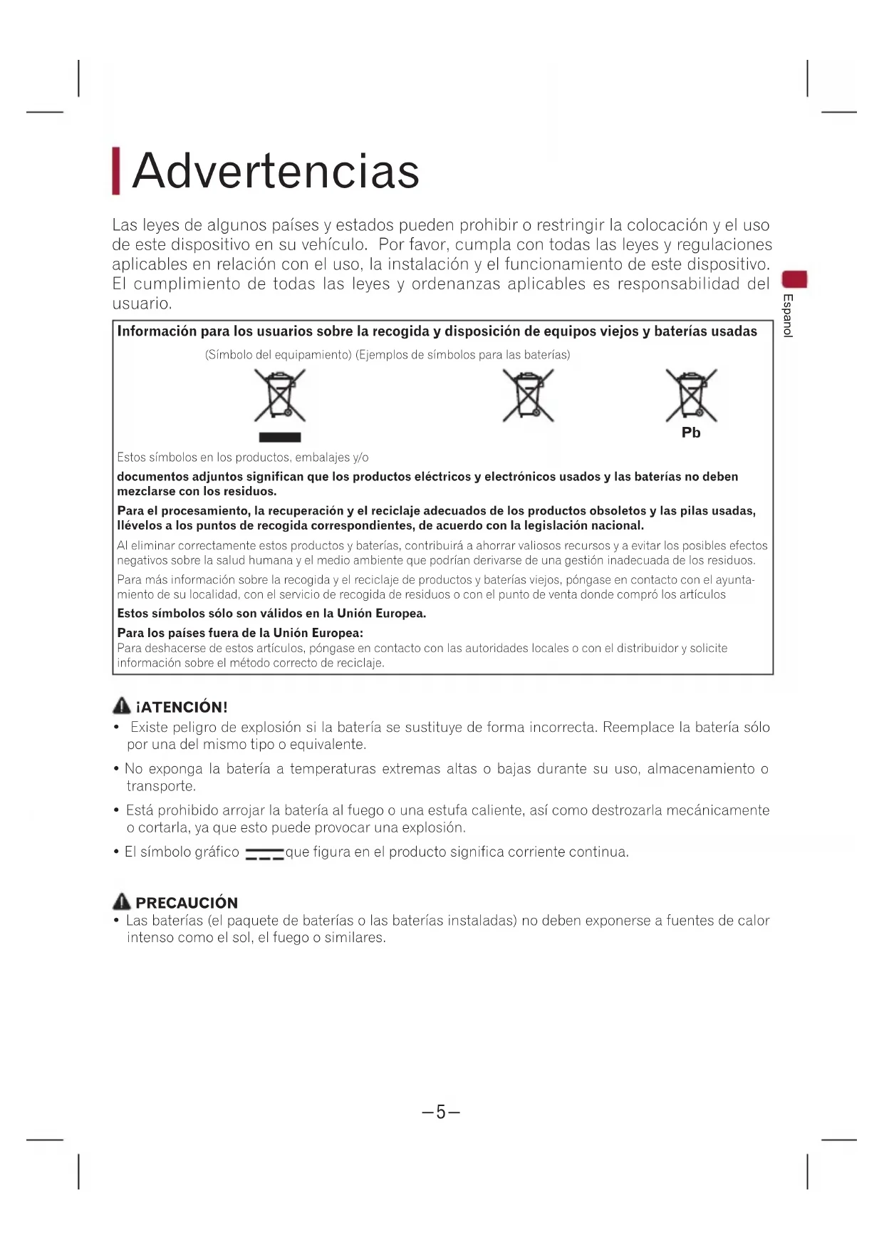 - Installeer dit product niet op plaatsen die kunnen worden blootgesteld aan hoge temperaturen of vocht, zoals: — Dichtbij een radiator, luchtopening of airconditioningapparaat. — Plaatsen die blootgesteld kunnen worden aan regen, zoals dicht bij een portier of op de vloer van het voertuig. Español Precauciones de seguridad Ciertas leyes nacionales y estatales pueden prohibir o restringir la colocación y el uso de este producto en su vehículo. Cumpla con todas las leyes y regulaciones aplicables en relación con el uso, la instalación y el funcionamiento de este producto. El cumplimiento de todas las leyes y ordenanzas aplicables es responsabilidad del usuario. ADVERTENCIA• No instale este producto en su vehículo si su ubicación o uso obstruye la visión clara que el conductor tiene de la carretera o el funcionamiento de cualquier airbag del vehículo. También es responsabilidad del conductor conocer y cumplir las leyes, normas y reglamentos del lugar de conducción, incluidos, por ejemplo, los derechos de privacidad de los pasajeros, y no utilizar el dispositivo en ningún lugar donde su instalación o uso esté prohibido. ADVERTENCIA