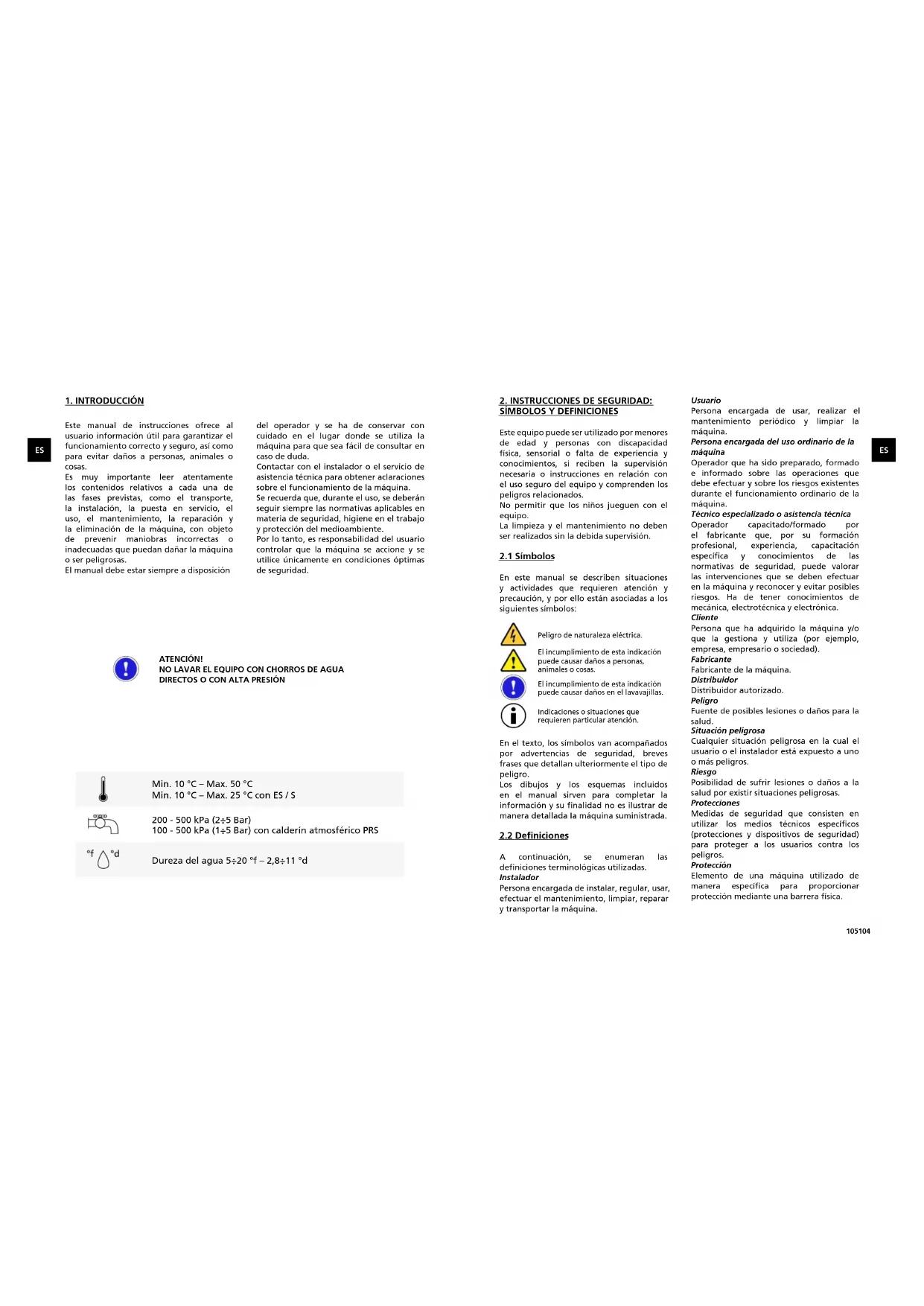 A continuación, se enumeran las definiciones terminológicas utilizadas. Instalador Persona encargada de instalar, regular, usar, efectuar el mantenimiento, limpiar, reparar y transportar la máquina. Usuario Persona encargada de usar, realizar el mantenimiento periódico y limpiar la máquina. Persona encargada del uso ordinario de la máquina Operador que ha sido preparado, formado e informado sobre las operaciones que debe efectuar y sobre los riesgos existentes durante el funcionamiento ordinario de la máquina. Técnico especializado o asistencia técnica Operador capacitado/formado por el fabricante que, por su formación profesional, experiencia, capacitación específica y conocimientos de las normativas de seguridad, puede valorar las intervenciones que se deben efectuar en la máquina y reconocer y evitar posibles riesgos. Ha de tener conocimientos de mecánica, electrotécnica y electrónica. Cliente Persona que ha adquirido la máquina y/o que la gestiona y utiliza (por ejemplo, empresa, empresario o sociedad). Fabricante Fabricante de la máquina. Distribuidor Distribuidor autorizado. Peligro Fuente de posibles lesiones o daños para la salud. Situación peligrosa Cualquier situación peligrosa en la cual el usuario o el instalador está expuesto a uno o más peligros. Riesgo Posibilidad de sufrir lesiones o daños a la salud por existir situaciones peligrosas. Protecciones Medidas de seguridad que consisten en utilizar los medios técnicos específicos (protecciones y dispositivos de seguridad) para proteger a los usuarios contra los peligros. Protección Elemento de una máquina utilizado de manera específica para proporcionar protección mediante una barrera física. Peligro de naturaleza eléctrica. El incumplimiento de esta indicación puede causar daños a personas, animales o cosas. Indicaciones o situaciones que requieren particular atención. El incumplimiento de esta indicación puede causar daños en el lavavajillas.107106