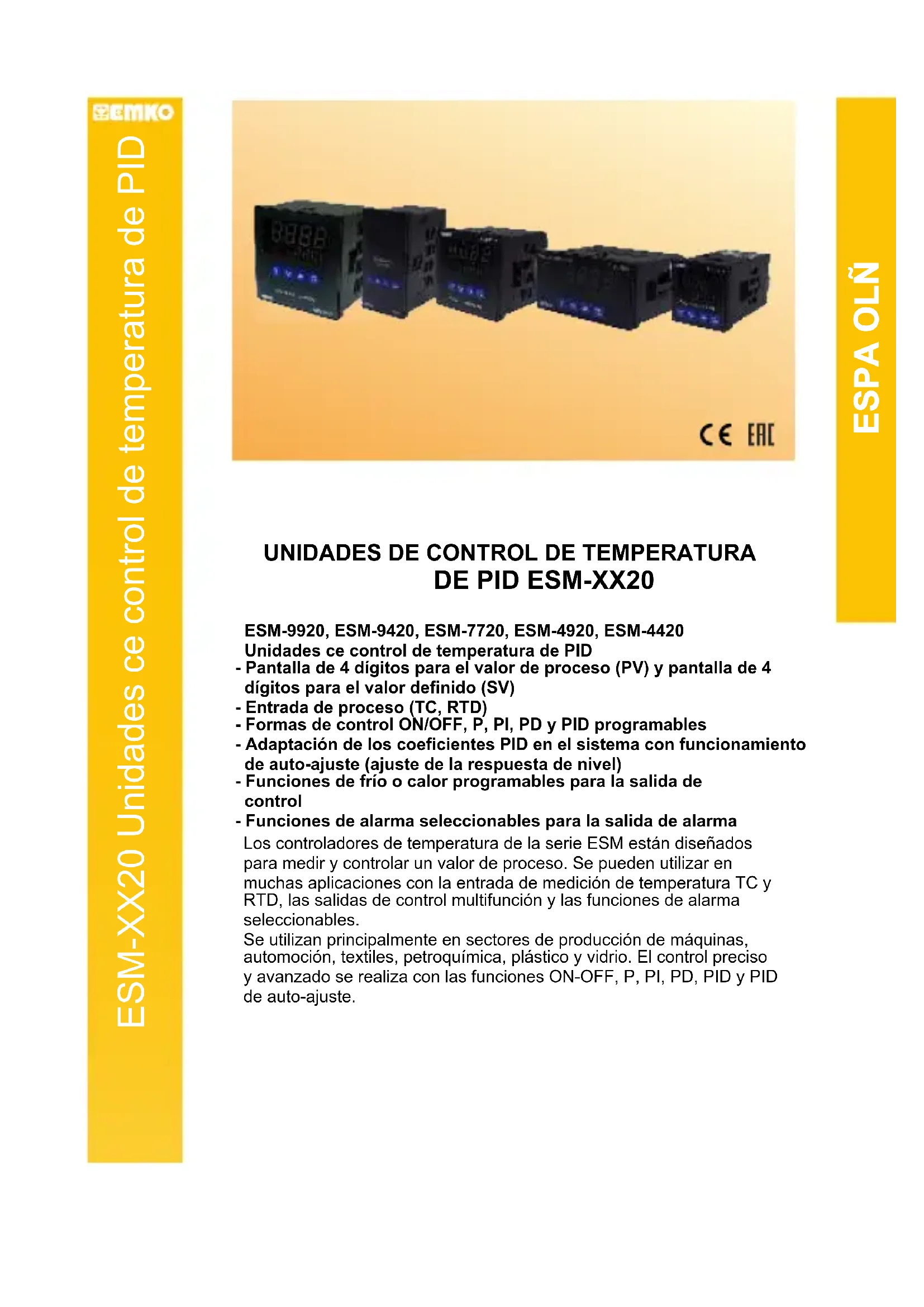 Los controladores de temperatura de la serie ESM están diseñados para medir y controlar un valor de proceso. Se pueden utilizar en muchas aplicaciones con la entrada de medición de temperatura TC y RTD, las salidas de control multifunción y las funciones de alarma seleccionables.Se utilizan principalmente en sectores de producción de máquinas, automoción, textiles, petroquímica, plástico y vidrio. El control preciso y avanzado se realiza con las funciones ON-OFF, P, PI, PD, PID y PID de auto-ajuste. ESM-9920, ESM-9420, ESM-7720, ESM-4920, ESM-4420 Unidades ce control de temperatura de PID- Pantalla de 4 dígitos para el valor de proceso (PV) y pantalla de 4 dígitos para el valor definido (SV)- Entrada de proceso (TC, RTD)- Formas de control ON/OFF, P, PI, PD y PID programables- Adaptación de los coeficientes PID en el sistema con funcionamiento de auto-ajuste (ajuste de la respuesta de nivel) - Funciones de frío o calor programables para la salida de control - Funciones de alarma seleccionables para la salida de alarmaESPA OLÑ