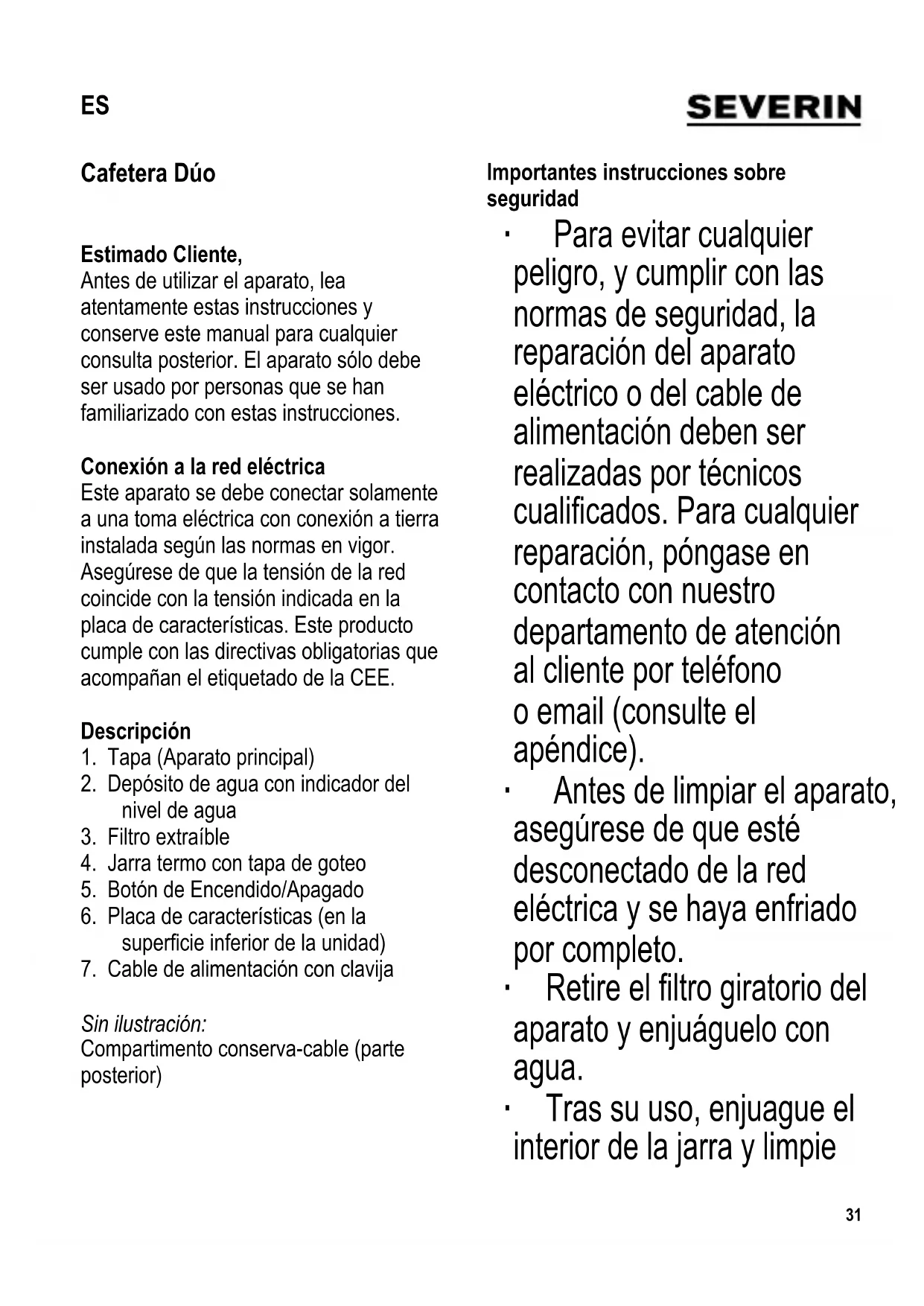 de seguridad. ∙ No se debe permitir que los niños realicen ningún trabajo de limpieza o mantenimiento del aparato a menos que estén bajo vigilancia y tengan más de 8 años. ∙ El aparato y su cable eléctrico siempre se deben mantener fuera del alcance de niños menores de 8 años. ∙ Los niños no deben jugar con el aparato. ∙ Precaución: Mantenga a los niños alejados del material de embalaje, porque podría ser peligroso, existe el peligrodeasxia. ∙ Cierre siempre la jarra con su tapa de goteo. No deje la jarra termo desatendida y al alcance de los niños. ∙ Antes de utilizar el aparato, siempre se debe comprobar que tanto la unidad principal, el cable de alimentación como cualquier accesorio no están defectuosos. En caso de que el aparato hayacaídosobreunasuperciedura, o se haya tirado en exceso del cable de alimentación, no se deberá utilizar de nuevo: incluso los desperfectos no visibles pueden tener efectos adversos sobre la seguridad en el uso del aparato. ∙ Coloquelacafeterasobreunasupercie estable, antideslizante y a prueba de salpicaduras. ∙ Evite que la carcasa o el cable estén en contactoconsuperciescalientes,tales como placas o llamas. ∙ No permita que el cable eléctrico cuelgue suelto; el cable se debe mantenersucientementealejadodelas partes calientes del aparato. ∙ Desenchufe siempre el aparato - si hay una avería, - después del uso, y - antes de limpiarlo. ∙ Para desenchufar, no tire nunca del cable; agarre la clavija. ∙ No toque el enchufe con las manos húmedas. ∙ Antes de abrir la tapa de la cafetera o de cambiar los accesorios, desenchúfela y déjela enfriar. De no ser así, el agua caliente o el vapor que desprende pueden causarle quemaduras. ∙ Supervise la cafetera mientras la utiliza. ∙ Cierre siempre la jarra con su tapa de goteo. No deje la jarra termo desatendida y al alcance de los niños. ∙ No se acepta responsabilidad alguna si hay averías a consecuencia del uso incorrecto del aparato o si estas instrucciones no han sido observadas debidamente.34 104 x 142 mm Compartimento para la conservación del cable En la parte posterior del aparato, existe un compartimento para la conservación del cable. Extraiga el cable a la longitud deseada antes de usar el aparato. Desconexión automática Para ahorrar energía, los modelos de cafeteras con una jarra termo al vacío se apagarán automáticamente cuando haya concluido el ciclo de elaboración del café. Antes del primer uso Antes de preparar café por primera vez, limpie la cafetera en profundidad haciéndola funcionar 2 o 3 veces, llenando el depósito de agua hasta su máxima capacidad pero sin añadir café. Realice este proceso por separado en cada lado. Esta operación es igualmente válida cuando no se ha utilizado la cafetera durante un cierto período de tiempo o incluso después del proceso de descalcicación. Consejos prácticos ∙ Las marcas por duplicado en cada uno de los depósitos de agua le ayudarán a medir la cantidad de agua necesaria para preparar el número deseado de tazas de café. Las marcas situadas a su izquierda corresponden a tazas medianas con una capacidad aproximada de unos 125 ml. Tenga cuidado de no excederse en el número de tazas indicado. ∙ Si necesita varios ciclos consecutivos de elaboración de café, apague la cafetera después de cada ciclo y permita que el aparato se enfríe durante aprox. 5 minutos. ∙ ¡Atención! Cuide de no poner agua en eldepósitodeaguaunaveznalizada la preparación del café, ya que puede salir vapor caliente por la boquilla y ser causa de quemaduras. ¡Peligro de quemaduras! ∙ Precaución: No intente abrir la tapa durante el proceso de elaboración del café: existe peligro de quemaduras. Modo de uso El café se puede preparar en un lado, o en ambos lados a la vez. ∙ Depósito de agua: Abra la tapa, llene el depósito con la cantidad de agua fría deseada y cierre la tapa. ∙ Filtro de papel: Introduzcaunltrodepapeltamaño-4 enelsoporteparaelltro,primero deberá doblar los lados perforados del ltro. ∙ Añadir los granos de café: Es aconsejable utilizar café molido, aproximadamente 6 gr. =1½ - 2 cucharaditas por taza, para una taza mediana (125 ml). ∙ Disposición de la jarra termo: Coloque la tapa de goteo sobre la jarra. Si se ha introducido correctamente, la tapa conseguirá desactivar el mecanismo interrumpe-goteo en el soportedelltroduranteelciclode elaboración del café. Vuelva a situar la jarra en la cafetera. ∙ Inicio del proceso:104 x 142 mm