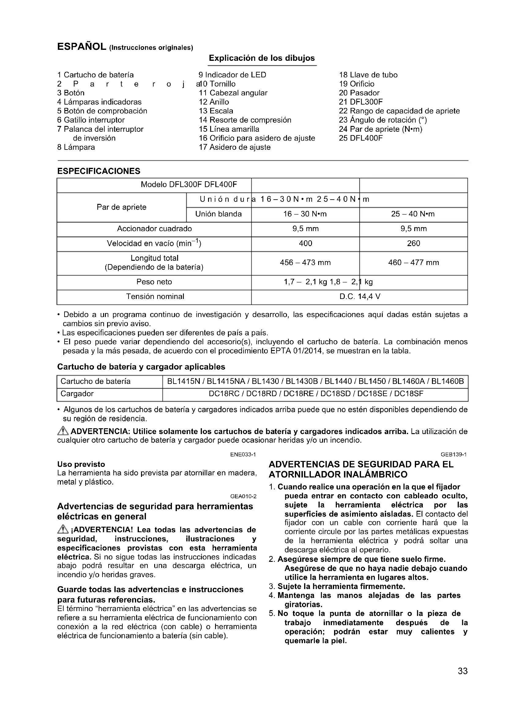 Alleen voor Europese landen De EG-verklaring van conformiteit is bijgesloten als Aanhangsel A bij deze gebruiksaanwijzing.33 ESPAÑOL (Instrucciones originales) Explicación de los dibujos 1 Cartucho de batería 2Parte roja 3 Botón 4 Lámparas indicadoras 5 Botón de comprobación 6 Gatillo interruptor 7 Palanca del interruptor de inversión 8 Lámpara 9 Indicador de LED 10 Tornillo 11 Cabezal angular 12 Anillo 13 Escala 14 Resorte de compresión 15 Línea amarilla 16 Orificio para asidero de ajuste 17 Asidero de ajuste 18 Llave de tubo 19 Orificio 20 Pasador 21 DFL300F 22 Rango de capacidad de apriete 23 Ángulo de rotación (°) 24 Par de apriete (N•m) 25 DFL400F ESPECIFICACIONES