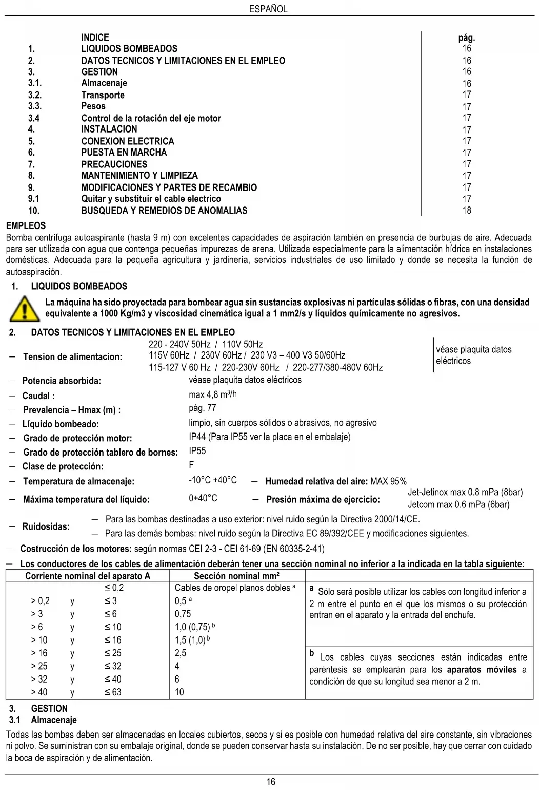 Para las demás bombas: nivel ruido según la Directiva EC 89/392/CEE y modificaciones siguientes. − Costrucción de los motores: según normas CEI 2-3 - CEI 61-69 (EN 60335-2-41) − Los conductores de los cables de alimentación deberán tener una sección nominal no inferior a la indicada en la tabla siguiente: Corriente nominal del aparato A Sección nominal mm²