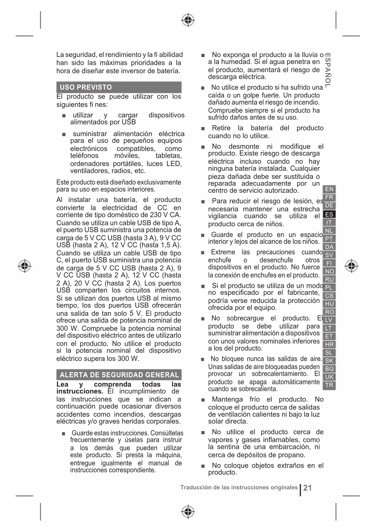 Übersetzung der originalanleitungLa seguridad, el rendimiento y la fi abilidad han sido las máximas prioridades a la hora de diseñar este inversor de batería. USO PREVISTO El producto se puede utilizar con los siguientes fi nes: ■ utilizar y cargar dispositivos alimentados por USB ■ suministrar alimentación eléctrica para el uso de pequeños equipos electrónicos compatibles, como teléfonos móviles, tabletas, ordenadores portátiles, luces LED, ventiladores, radios, etc. Este producto está diseñado exclusivamente para su uso en espacios interiores. Al instalar una batería, el producto convierte la electricidad de CC en corriente de tipo doméstico de 230 V CA. Cuando se utiliza un cable USB de tipo A, el puerto USB suministra una potencia de carga de 5 V CC USB (hasta 3 A), 9 V CC USB (hasta 2 A), 12 V CC (hasta 1,5 A). Cuando se utiliza un cable USB de tipo C, el puerto USB suministra una potencia de carga de 5 V CC USB (hasta 2 A), 9 V CC USB (hasta 2 A), 12 V CC (hasta 2 A), 20 V CC (hasta 2 A). Los puertos USB comparten los circuitos internos. Si se utilizan dos puertos USB al mismo tiempo, los dos puertos USB ofrecerán una salida de tan solo 5 V. El producto ofrece una salida de potencia nominal de 300 W. Compruebe la potencia nominal del dispositivo eléctrico antes de utilizarlo con el producto. No utilice el producto si la potencia nominal del dispositivo eléctrico supera los 300 W.