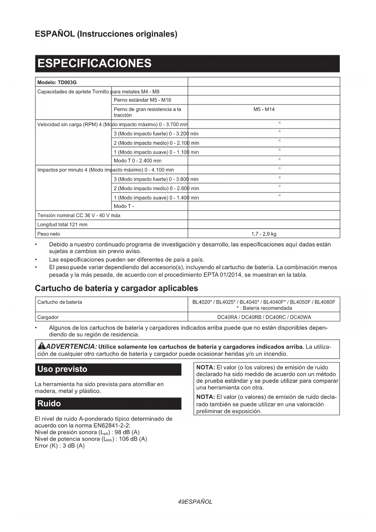 - Elpesopuedevariardependiendodelaccesorio(s),incluyendoelcartuchodebatería.Lacombinaciónmenos pesadaylamáspesada,deacuerdoconelprocedimientoEPTA01/2014,semuestranenlatabla. Cartucho de batería y cargador aplicables Cartuchodebatería BL4020* / BL4025* / BL4040* / BL4040F* / BL4050F / BL4080F *:Bateríarecomendada Cargador DC40RA / DC40RB / DC40RC / DC40WA
