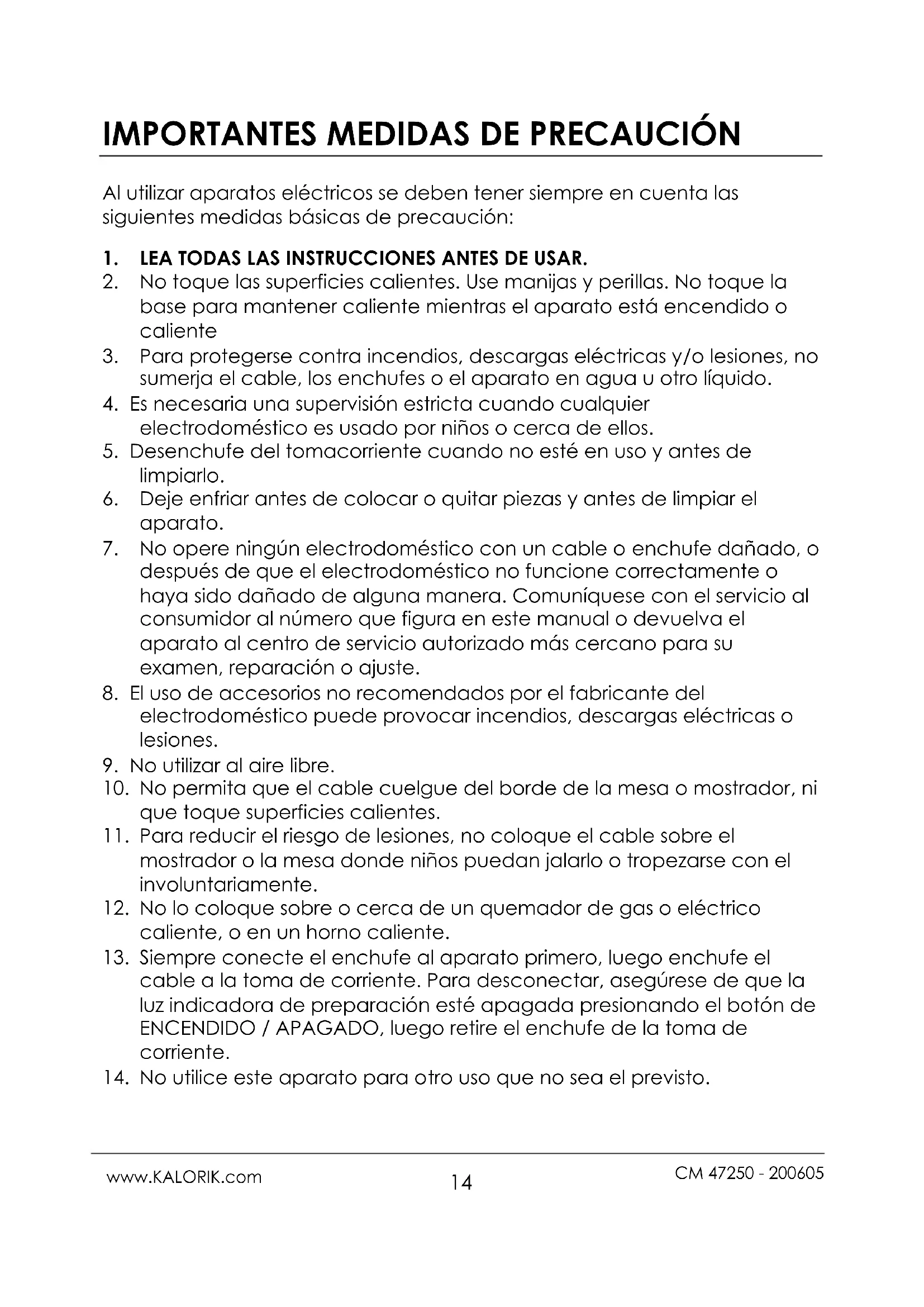 CM 47250 - 200605 www.KALORIK.com GARANTÍA Le sugerimos rellenen y nos envíen rápidamente la Tarjeta de Registro de Producto adjunta para facilitar la verificación de la fecha de compra. Por lo tanto, la devolución de esa Tarjeta de Registro de Producto no es una condición imprescindible para la aplicación de esa garantía. Puede también rellenar dicha tarjeta de garantía en línea en la dirección siguiente: www.KALORIK.com A partir de la fecha de compra, este producto KALORIK está garantizado un año contra los defectos materiales y de fabricación, en los Estados Unidos y en Canadá. Esta garantía no es transferible. Conserve la prueba de compra original. Se exige una prueba de compra para obtener la aplicación de la garantía. Durante este período, si el producto KALORIK después de una inspección por parte de KALORIK, se manifiesta defectuoso, será reparado o remplazado, según lo que decida KALORIK, sin gastos para el consumidor. Si se envía un producto de remplazo, se aplicará la garantía que queda del producto original. Esta garantía no se aplica a los defectos causados por una mala utilización por parte del comprador o del usuario, o una negligencia al no respeto del manual de instrucciones KALORIK, o una utilización en un circuito eléctrico cuyo voltaje es diferente al que figura en el producto, o un desgaste normal, o modificaciones o reparaciones no autorizadas por KALORIK, o por un uso con fines comerciales. No existe garantía por las partes de cristal, jarras de cristal, filtros, cestos, cuchillas y accesorios en general. No existe tampoco garantía por las piezas perdidas por el usuario. Toda garantía de valor comercial o de adaptabilidad a este producto está limitada a un año también. Algunos estados no ponen límites a la duración de la garantía tácita o no autorizan la exclusión de daños y perjuicios accesorios o indirectos, por lo que puede que las restricciones anteriormente mencionadas no le sean aplicables a Usted. Esta garantía le otorga derechos legales particulares, pero usted puede tener también otro derechos que varían de un estado a otro y algunos derechos pueden variar de un estado a otro. Si el aparato tuviera un defecto durante el periodo de garantía y / o más de 30 días después de que se compró, no devuelva el aparato en la24