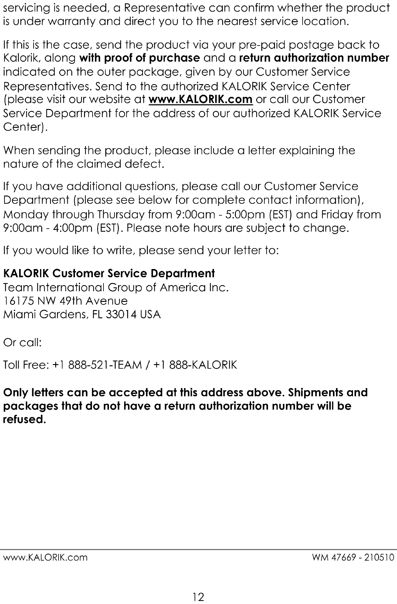 Avenue Miami Gardens, FL 33014 USA O llame gratuitamente (U.S.A.) al +1 888-521-TEAM / +1 888-KALORIK Las cartas se aceptan solo en la dirección anteriormente mencionada. Los envíos y paquetes que no tengan número de autorización de devolución serán rechazados.25 www.KALORIK.com WM 47669 - 210510