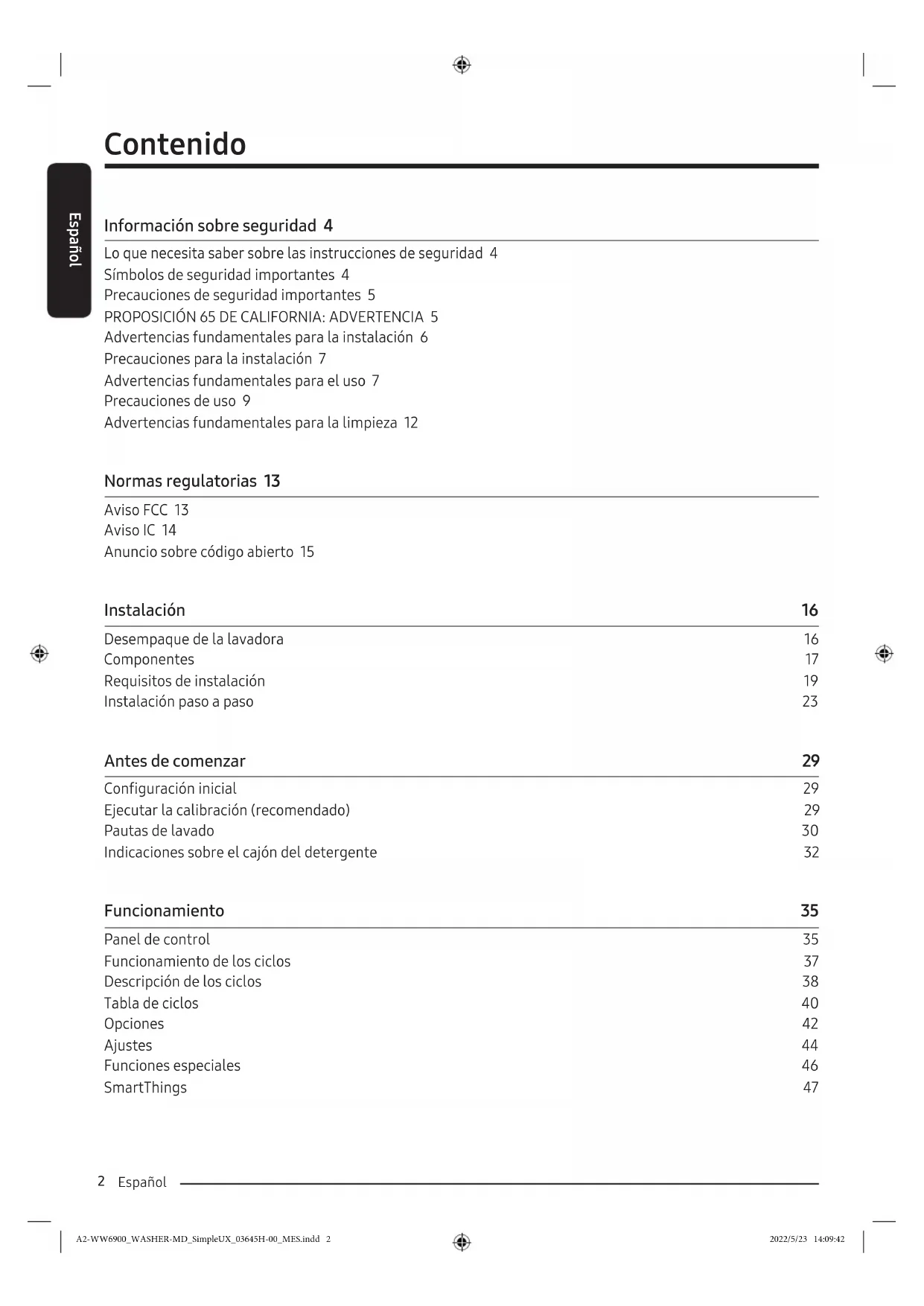 Advertencias fundamentales para la instalación 6 Precauciones para la instalación 7 Advertencias fundamentales para el uso 7 Precauciones de uso 9 Advertencias fundamentales para la limpieza 12 Normas regulatorias 13 Aviso FCC 13 Aviso IC 14 Anuncio sobre código abierto 15 Instalación 16 Desempaque de la lavadora 16 Componentes 17 Requisitos de instalación 19 Instalación paso a paso 23 Antes de comenzar 29 Configuración inicial 29 Ejecutar la calibración (recomendado) 29 Pautas de lavado 30 Indicaciones sobre el cajón del detergente 32 Funcionamiento 35 Panel de control 35 Funcionamiento de los ciclos 37 Descripción de los ciclos 38 Tabla de ciclos 40 Opciones 42 Ajustes 44 Funciones especiales 46 SmartThings 47 A2-WW6900_WASHER-MD_SimpleUX_03645H-00_MES.indd 2 2022/5/23 14:09:42Español Español