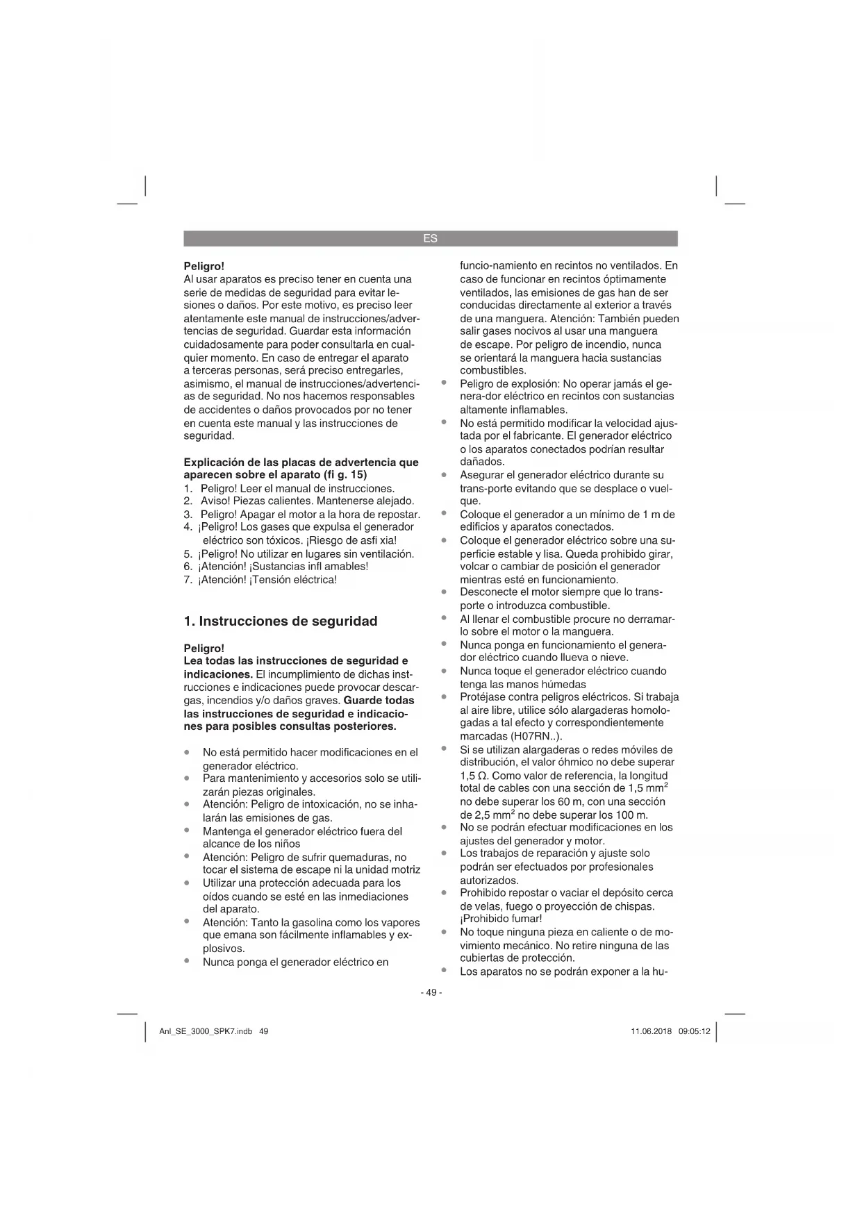 Este aparato ha sido concebido para ser utiliz- ado en todas las aplicaciones que prevén un funcionamiento con 230V~ y 400V 3~. Es preciso observar las restricciones indicadas en las adver- tencias de seguridad adicionales. La fi nalidad del generador es accionar herramientas eléctricas y suministrar corriente a fuentes de iluminación. Para aparatos domésticos, comprobar la idonei- dad conforme a las indicaciones del fabricante. En caso de duda, consultar al concesionario autorizado. Utilizar la máquina sólo en los casos que se indi- can explícitamente como de uso adecuado. Cual- quier otro uso no será adecuado. En caso de uso inadecuado, el fabricante no se hace responsable de daños o lesiones de cualquier tipo; el respon- sable es el usuario u operario de la máquina. Tener en consideración que nuestro aparato no está indicado para un uso comercial, industrial o en taller. No asumiremos ningún tipo de garantía cuando se utilice el aparato en zonas industria- les, comerciales o talleres, así como actividades similares. Anl_SE_3000_SPK7.indb 51Anl_SE_3000_SPK7.indb 51 11.06.2018 09:05:1211.06.2018 09:05:12ES