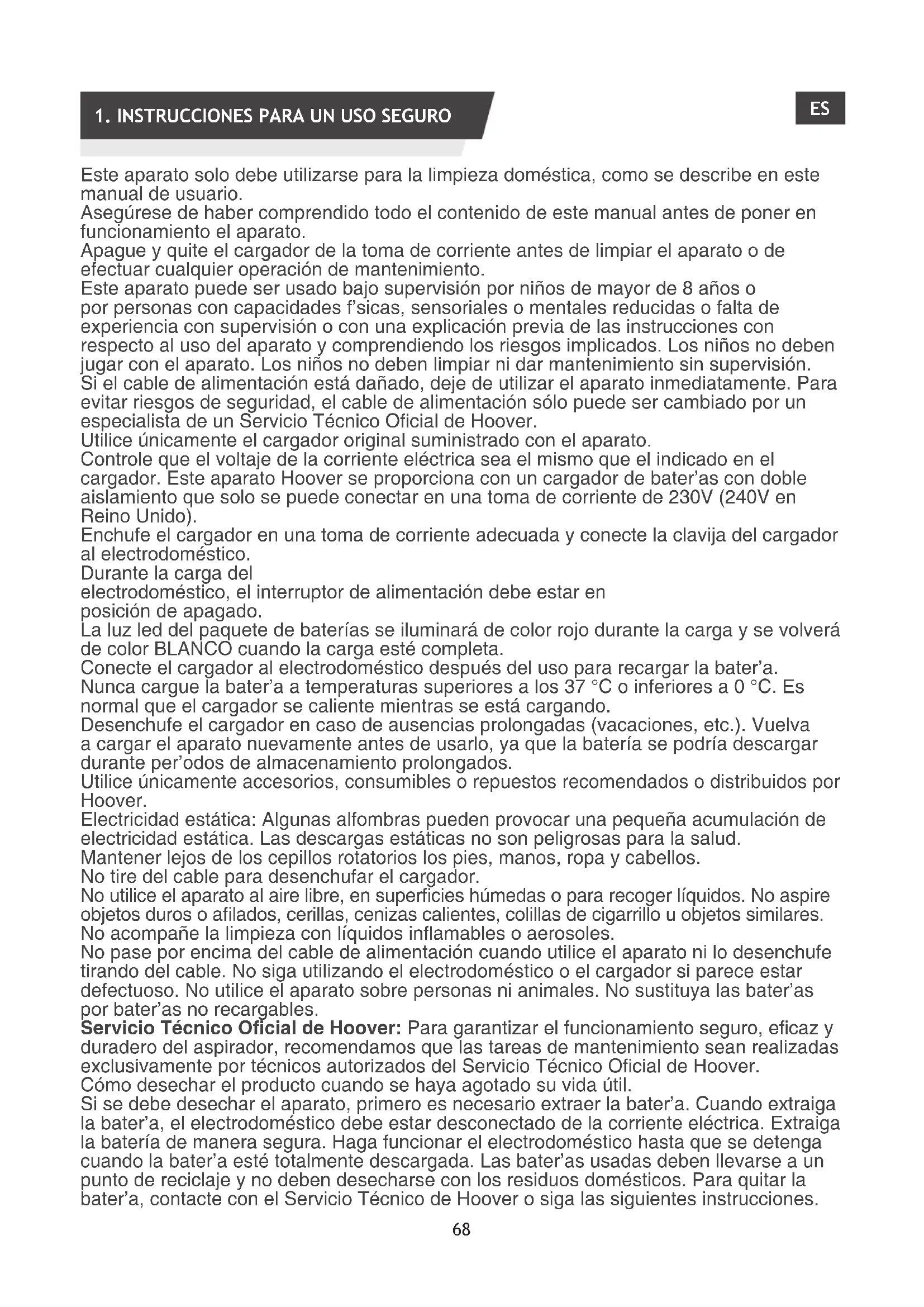 Este aparato solo debe utilizarse para la limpieza doméstica, como se describe en este manual de usuario. Asegúrese de haber comprendido todo el contenido de este manual antes de poner en funcionamiento el aparato. Apague y quite el cargador de la toma de corriente antes de limpiar el aparato o de efectuar cualquier operación de mantenimiento. Este aparato puede ser usado bajo supervisión por niños de mayor de 8 años o por personas con capacidades físicas, sensoriales o mentales reducidas o falta de experiencia con supervisión o con una explicación previa de las instrucciones con respecto al uso del aparato y comprendiendo los riesgos implicados. Los niños no deben jugar con el aparato. Los niños no deben limpiar ni dar mantenimiento sin supervisión. Si el cable de alimentación está dañado, deje de utilizar el aparato inmediatamente. Para evitar riesgos de seguridad, el cable de alimentación sólo puede ser cambiado por un especialista de un Servicio Técnico Ocial de Hoover. Utilice únicamente el cargador original suministrado con el aparato. Controle que el voltaje de la corriente eléctrica sea el mismo que el indicado en el cargador. Este aparato Hoover se proporciona con un cargador de baterías con doble aislamiento que solo se puede conectar en una toma de corriente de 230V (240V en Reino Unido). Enchufe el cargador en una toma de corriente adecuada y conecte la clavija del cargador al electrodoméstico. Durante la carga del electrodoméstico, el interruptor de alimentación debe estar en posición de apagado. La luz led del paquete de baterías se iluminará de color rojo durante la carga y se volverá de color BLANCO cuando la carga esté completa. Conecte el cargador al electrodoméstico después del uso para recargar la batería. Nunca cargue la batería a temperaturas superiores a los 37 °C o inferiores a 0 °C. Es normal que el cargador se caliente mientras se está cargando. Desenchufe el cargador en caso de ausencias prolongadas (vacaciones, etc.). Vuelva a cargar el aparato nuevamente antes de usarlo, ya que la batería se podría descargar durante períodos de almacenamiento prolongados. Utilice únicamente accesorios, consumibles o repuestos recomendados o distribuidos por Hoover. Electricidad estática: Algunas alfombras pueden provocar una pequeña acumulación de electricidad estática. Las descargas estáticas no son peligrosas para la salud. Mantener lejos de los cepillos rotatorios los pies, manos, ropa y cabellos. No tire del cable para desenchufar el cargador. No utilice el aparato al aire libre, en supercies húmedas o para recoger líquidos. No aspire objetos duros o alados, cerillas, cenizas calientes, colillas de cigarrillo u objetos similares. No acompañe la limpieza con líquidos inamables o aerosoles. No pase por encima del cable de alimentación cuando utilice el aparato ni lo desenchufe tirando del cable. No siga utilizando el electrodoméstico o el cargador si parece estar defectuoso. No utilice el aparato sobre personas ni animales. No sustituya las baterías por baterías no recargables. ServicioTécnicoOcialdeHoover: Para garantizar el funcionamiento seguro, ecaz y duradero del aspirador, recomendamos que las tareas de mantenimiento sean realizadas exclusivamente por técnicos autorizados del Servicio Técnico Ocial de Hoover. Cómo desechar el producto cuando se haya agotado su vida útil. Si se debe desechar el aparato, primero es necesario extraer la batería. Cuando extraiga la batería, el electrodoméstico debe estar desconectado de la corriente eléctrica. Extraiga la batería de manera segura. Haga funcionar el electrodoméstico hasta que se detenga cuando la batería esté totalmente descargada. Las baterías usadas deben llevarse a un punto de reciclaje y no deben desecharse con los residuos domésticos. Para quitar la batería, contacte con el Servicio Técnico de Hoover o siga las siguientes instrucciones. ES69 IMPORTANTE: Descargue siempre la batería completamente antes de desecharla. Haga funcionar el aspirador hasta que las baterías estén completamente descargadas. Quite el conector jack del cargador del electrodoméstico. Pulse los botones de desenganche del paquete de baterías y deslice para extraerlo. Nota: Si llega a experimentar problemas al desmontar el aspirador o para obtener más información sobre el funcionamiento, la recuperación y el reciclaje de este electrodoméstico, contacte con su Ayuntamiento o con el servicio de recogida de residuos domésticos de su zona. El Medio Ambiente: El símbolo que puede verse en el producto indica que este no puede tratarse como residuos domésticos. En su lugar, se debe entregar en un punto de recogida de electrodomésticos para el reciclaje de equipos eléctricos y electrónicos. La eliminación debe llevarse a cabo según los reglamentos medioambientales locales sobre eliminación de residuos. Para más información sobre el tratamiento, la recuperación y el reciclaje de este aparato, ponte en contacto con tu Ayuntamiento, el servicio de recogida de residuos domésticos o con el establecimiento donde hayas comprado el producto.