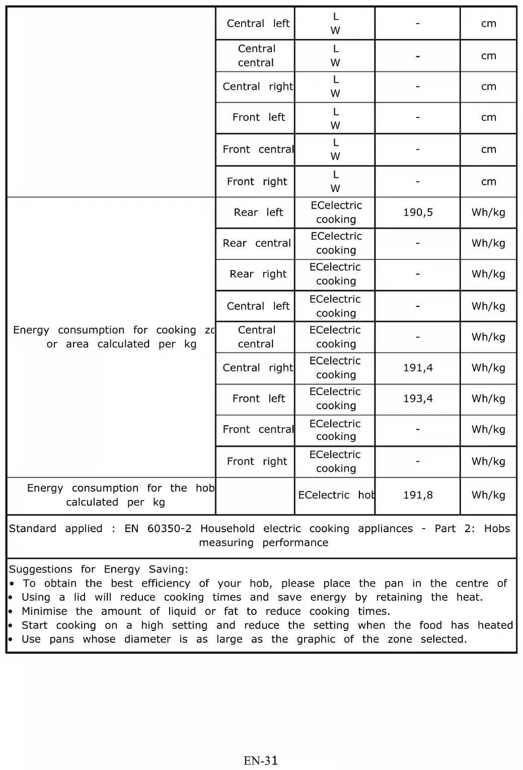 - cm Consumo energético en zona o área de cocción calculado en kg Trasera izquierda Cocina eléctrica CE 190,5 Wh/kg Trasera central Cocina eléctrica CE - Wh/kg Trasera derecha Cocina eléctrica CE - Wh/kg Central izquierda Cocina eléctrica CE - Wh/kg Central central Cocina eléctrica CE - Wh/kg Central derecha Cocina eléctrica CE 191,4 Wh/kg Delantera izquierda Cocina eléctrica CE 193,4 Wh/kg Delantera central Cocina eléctrica CE - Wh/kg Delantera derecha Cocina eléctrica CE - Wh/kg Consumo energético por placa de cocción calculado en kg Placa de cocción eléctrica CE 191,8 Wh/kg Norma aplicada: EN 60350-2 Aparatos electrodomésticos para cocinas eléctricas. Parte 2: Placas de cocción. Métodos de medida de la aptitud a la función. Recomendaciones para ahorrar energía: