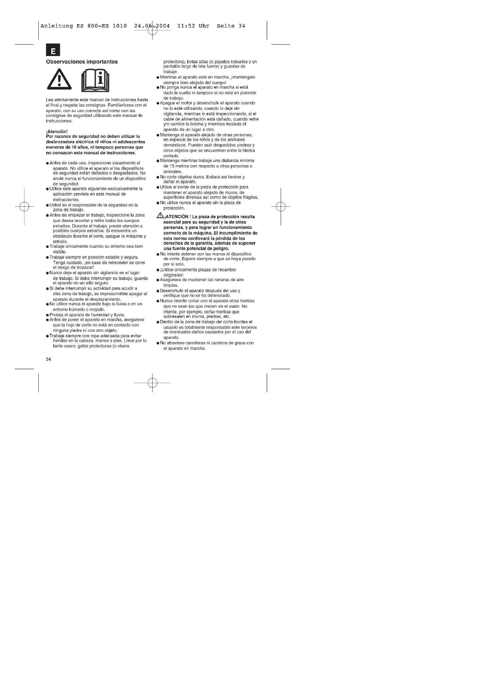 Anleitung ES 800-ES 1010 24.06.2004 11:52 Uhr Seite 34 Cuando no utilice el aparato, guárdelo en un sitio seco y fuera del alcance de los niños. Utilice el aparato siguiendo exclusivamente las instrucciones descritas en este manual. Verifique con regularidad que los tornillos están bien apretados. La tensión local debe coincidir con la especificada en la placa indicadora. Hay que inspeccionar con regularidad el cable de conexión para detectar eventuales daños o desgastes. Si el cable de conexión no está en perfecto estado no se debe utilizar el aparato. Los cables de conexión utilizados no deben ser más ligeros que los cables ligeros de tubo de caucho HO7RN-F, conforme a la norma DIN 57282/VDE 0282, y deben presentar un diámetro mínimo de 1,5mm