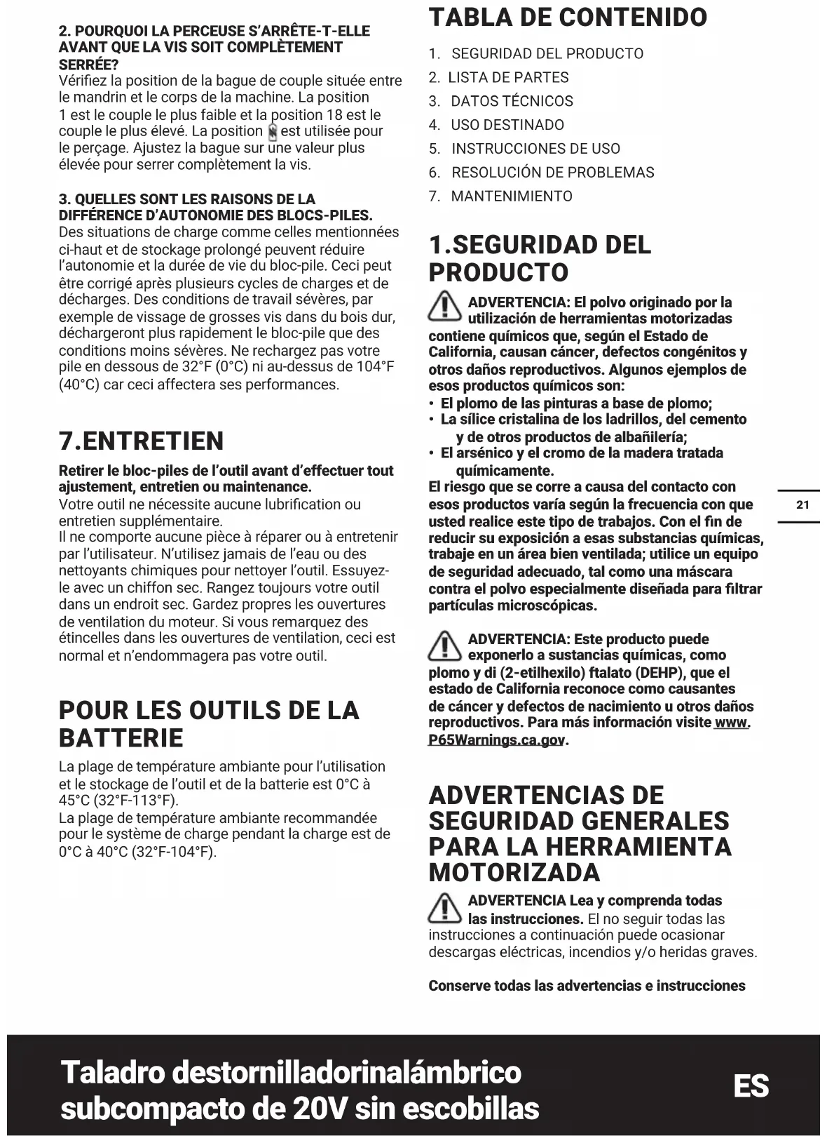 1.SEGURIDAD DEL PRODUCTO ADVERTENCIA: El polvo originado por la utilización de herramientas motorizadas contiene químicos que, según el Estado de California, causan cáncer, defectos congénitos y otros daños reproductivos. Algunos ejemplos de esos productos químicos son:
