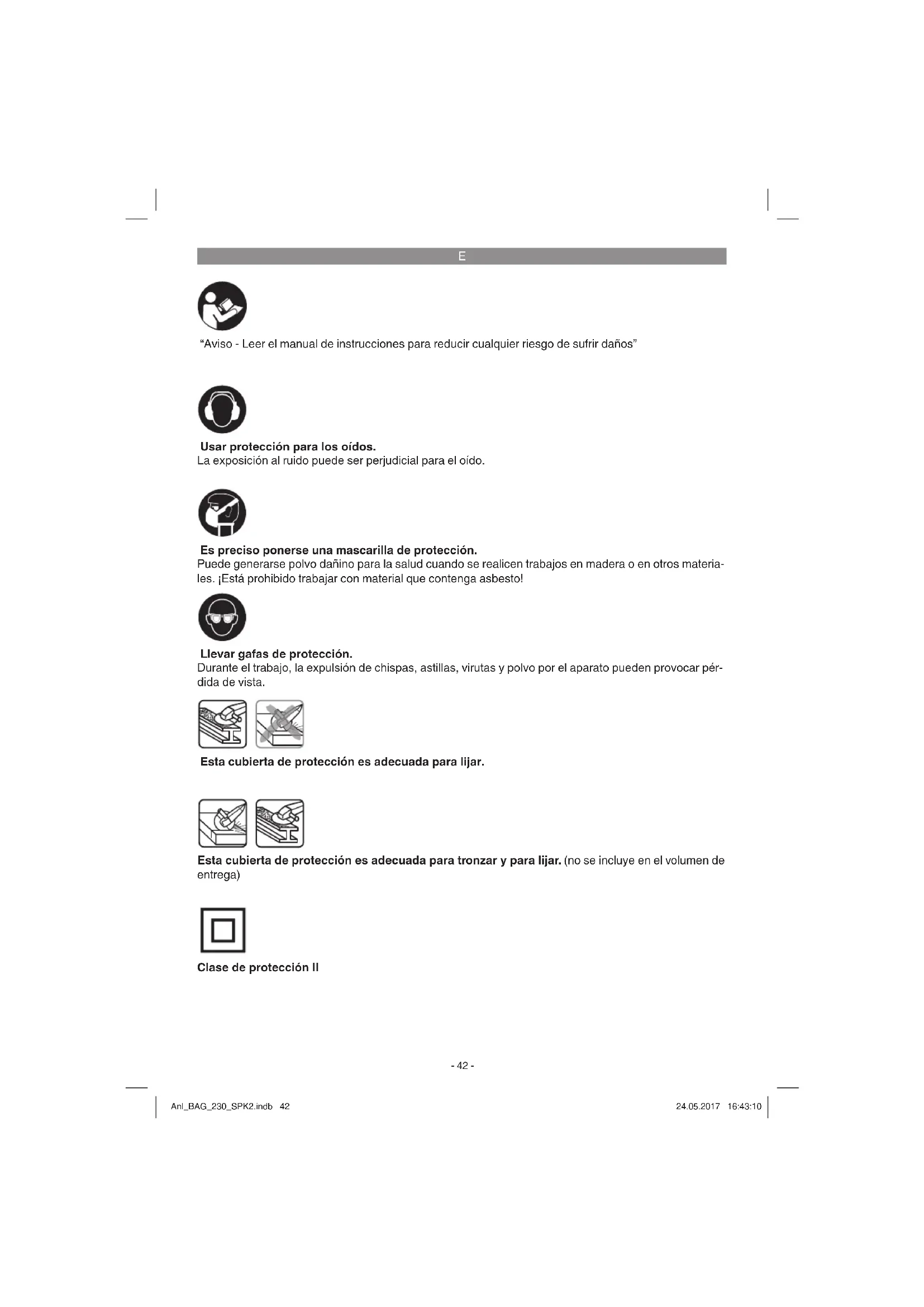 “Aviso - Leer el manual de instrucciones para reducir cualquier riesgo de sufrir daños” Usar protección para los oídos. La exposición al ruido puede ser perjudicial para el oído. Llevar gafas de protección. Durante el trabajo, la expulsión de chispas, astillas, virutas y polvo por el aparato pueden provocar pér- dida de vista. Es preciso ponerse una mascarilla de protección. Puede generarse polvo dañino para la salud cuando se realicen trabajos en madera o en otros materia- les. ¡Está prohibido trabajar con material que contenga asbesto! Esta cubierta de protección es adecuada para tronzar y para lijar. (no se incluye en el volumen de entrega) Esta cubierta de protección es adecuada para lijar. Clase de protección II Anl_BAG_230_SPK2.indb 42Anl_BAG_230_SPK2.indb 42 24.05.2017 16:43:1024.05.2017 16:43:10E