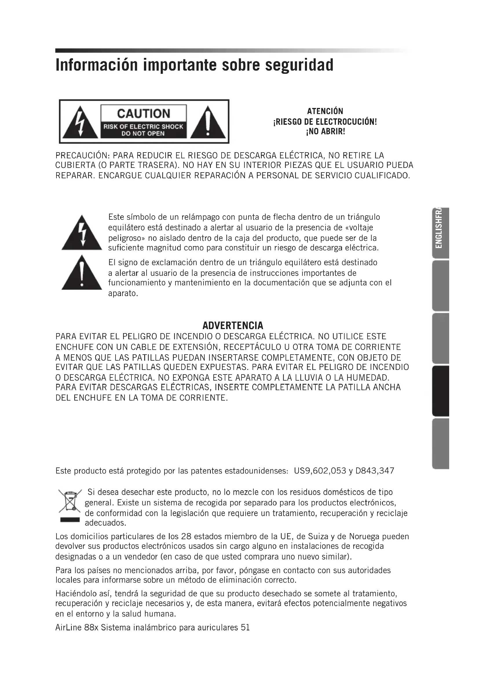 - La franja de temperatura óptima para usar y almacenar la pila es de 50°F - 86°F (30°C - 50°C). El rendimiento y el funcionamiento de la pila pueden disminuir a temperaturas inferiores a 50°F (30°C). Advertencia: Las pilas (el pack de pilas o las pilas instaladas) no deberán ser expuestas a calor excesivo, como la luz solar, fuego o similares. PRECAUCIÓN: Peligro de explosión si la batería no se reemplaza correctamente. Use únicamente pilas iguales o equivalentes para la sustitución. Deberá prestarse especial atención a los aspectos medioambientales del desechado de la pila.AirLine 88x Sistema inalámbrico para auriculares 59