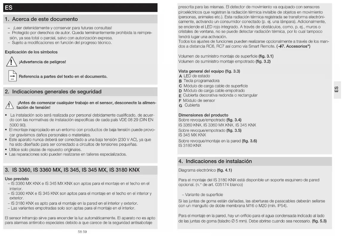 Referencia a partes del texto en el documento 2 Indicaciones generales de seguridad ¡Antes de comenzar cualquier trabajo en el sensor, desconecte la alimen-tación de tensión! • La instalación solo será realizada por personal debidamente cualificado, de acuer-do con las normativas de instalación específicas de cada país VDE 08 29 (DIN EN 5000 90).• El montaje inapropiado en un entorno con productos de baja tensión puede provo-car gravísimos daños personales o materiales.• Este aparato nunca deberá ser conectado a una baja tensión (230 V AC), ya que ha sido diseñado para ser conectado a circuitos de tensiones pequeñas.• Utilice solo piezas de repuesto originales.• Las reparaciones solo pueden realizarse en talleres especializados. 3 IS3360, IS3360 MX, IS345, IS 345 MX, IS3180 KNX Uso previsto – IS3360MXKNX e IS345MXKNX son aptos para el montaje en el techo en el interior. – IS3360KNX e IS345KNX son aptos para el montaje en el techo en el interior y exterior. – IS3180KNX es apto para el montaje en la pared en el interior y exterior. – Las variantes empotradas solo son aptas para el montaje en el interior.El sensor infrarrojo sirve para encender la luz automáticamente. El aparato no es apto para alarmas antirrobo especiales debido a que carece de la seguridad antisabotaje prescrita para las mismas. El detector de movimiento va equipado con sensores piroeléctricos que registran la radiación térmica invisible de objetos en movimiento (personas, animales etc.). Esta radiación térmica registrada se transforma electróni-camente, activando un consumidor conectado (p. ej. una lámpara). Adicionalmente, se enciende el LED rojo integrado. A través de obstáculos, como, p. ej., muros o cristales de ventana, no se puede detectar radiación térmica, por lo cual tampoco tendrá lugar una activación. Todos los ajustes de funciones pueden realizarse opcionalmente a través de los man-dos a distancia RC6, RC7 así como vía Smart Remote. ( "7Accesorios")Volumen de suministro montaje de superficie (fig 31)Volumen de suministro montaje empotrado (fig 32)Vista general del equipo (fig 33) LED de estado Tecla programadora Módulo de carga cable de superficie Módulo de carga cable empotrado Cubierta decorativa redonda o rectangular Módulo de sensor CubiertaDimensiones del producto Sobre revoque/empotrado (fig 34) IS3360 KNX, IS3360 MX KNX, IS345KNXSobre revoque/empotrado (fig 35) IS345 MXKNXSobre revoque/montaje en la pared (fig 36) IS3180KNX 4 Indicaciones de instalación Diagrama electrónico (fig41) Para el montaje del IS3180KNX está disponible un soporte esquinero de pared opcional. (n.° de art. 035174 blanco) – Variante de superficieSi las juntas de goma están dañadas, las aberturas de pasacables deberán sellarse con un manguito de doble membrana M16 o M20 (mín. IP54).Para el montaje en la pared, hay un orificio para el agua condensada indicado al lado de las juntas de goma (taladro Ø 5mm). Debe abrirse cuando sea necesario. (fig53)