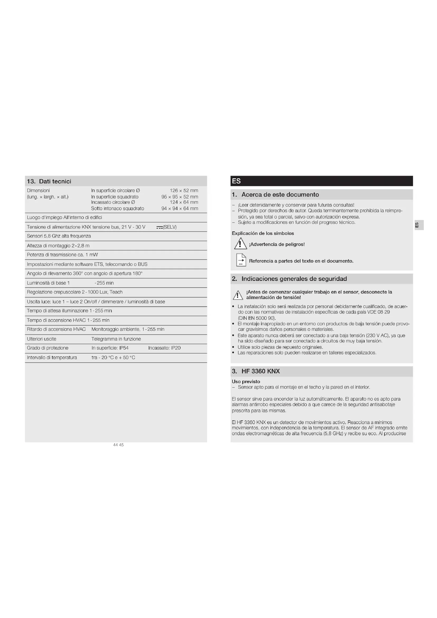 - Las reparaciones solo pueden realizarse en talleres especializados. 3 HF 3360 KNX Uso previsto – Sensor apto para el montaje en el techo y la pared en el interior. El sensor sirve para encender la luz automáticamente. El aparato no es apto para alarmas antirrobo especiales debido a que carece de la seguridad antisabotaje prescrita para las mismas. El HF3360KNX es un detector de movimientos activo. Reacciona a mínimos movimientos, con independencia de la temperatura. El sensor de AF integrado emite ondas electromagnéticas de alta frecuencia (5,8GHz) y recibe su eco. Al producirse